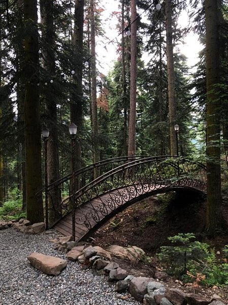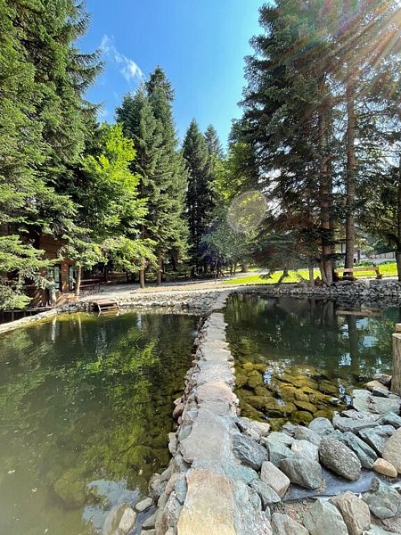 На территории есть зоны с отдыха с качелями, беседками и гамаками, а также специальное форелевое озеро, на котором можно порыбачить и прорубь, чтобы окунуться после посещения бани.