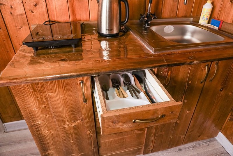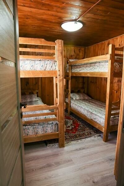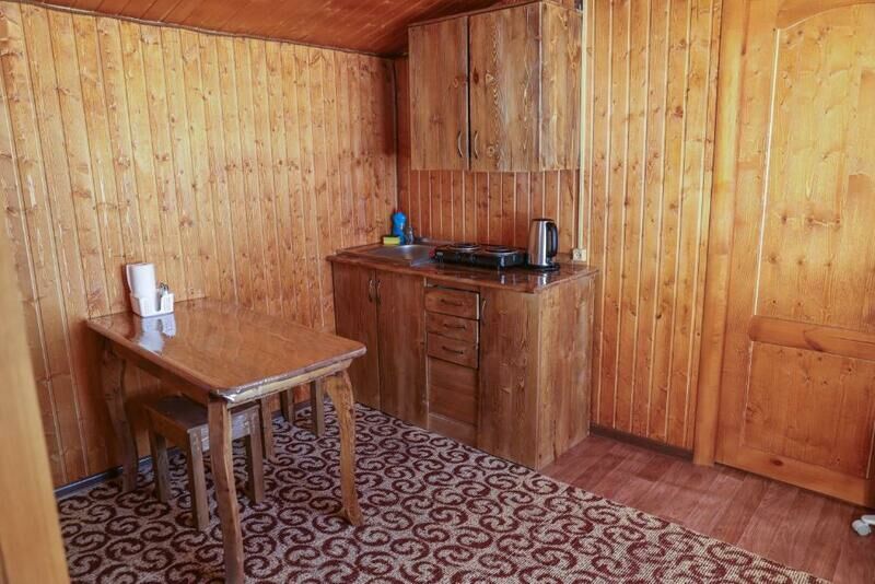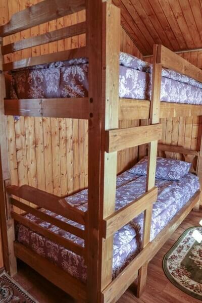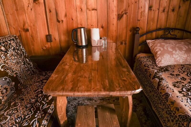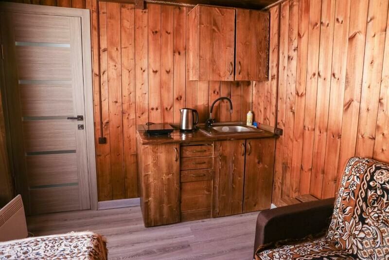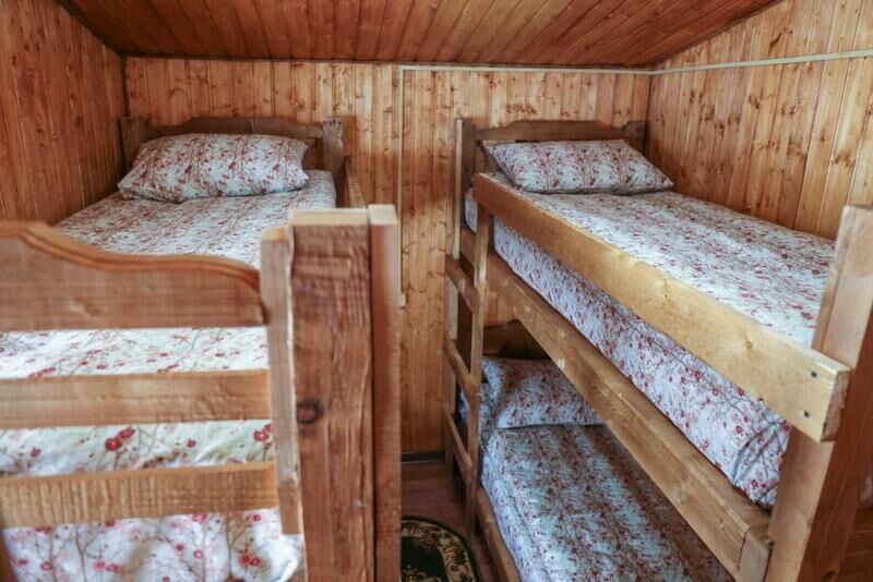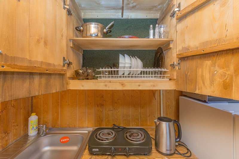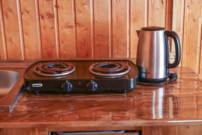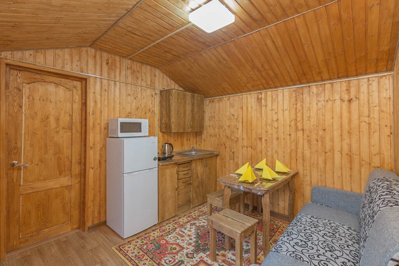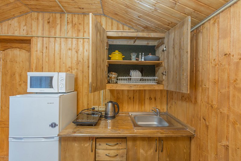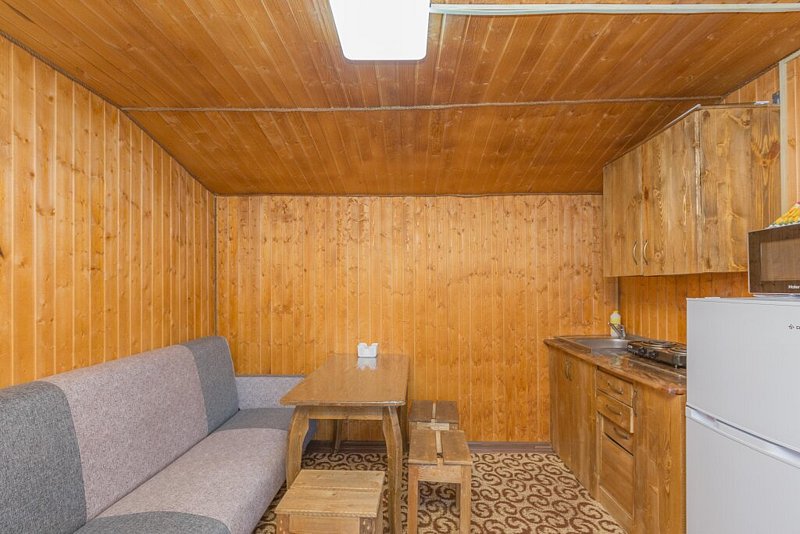 - В каждом домике — собственная ванная комната, мини-кухня с электроплиткой и чайником, спальня с двухъярусными кроватями и гостиная зона для комфортного отдыха.