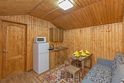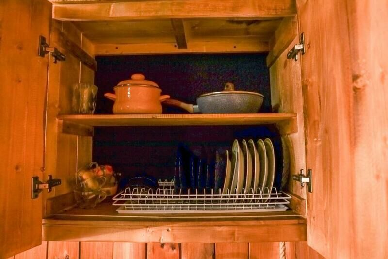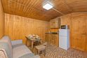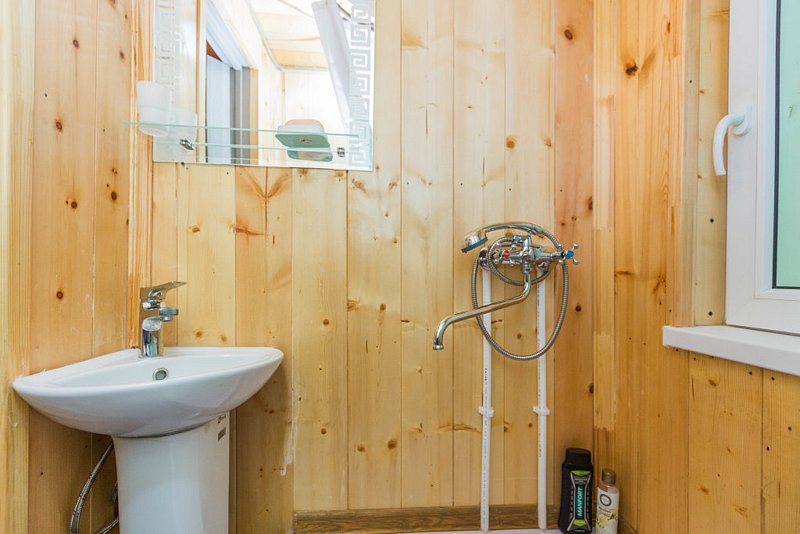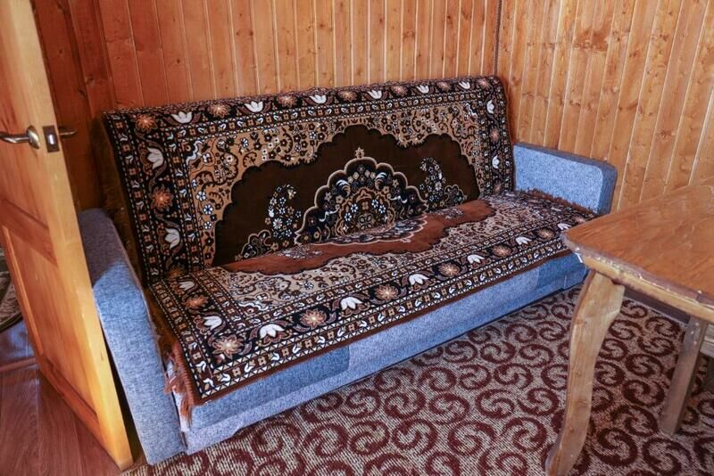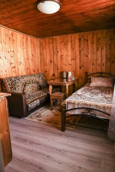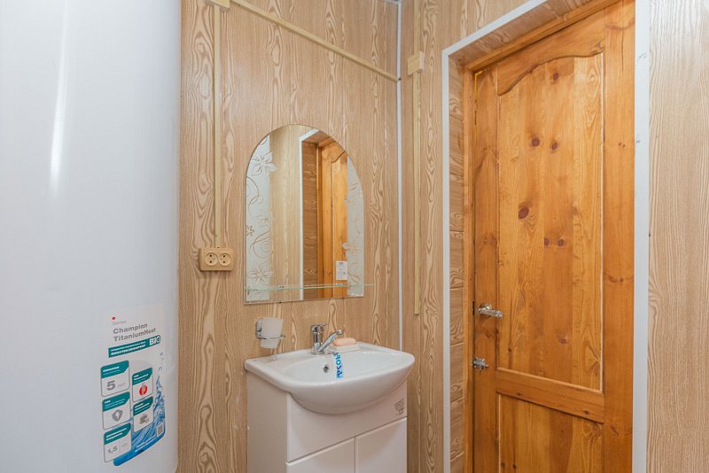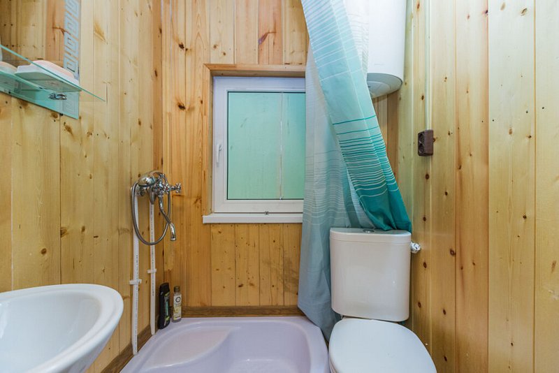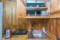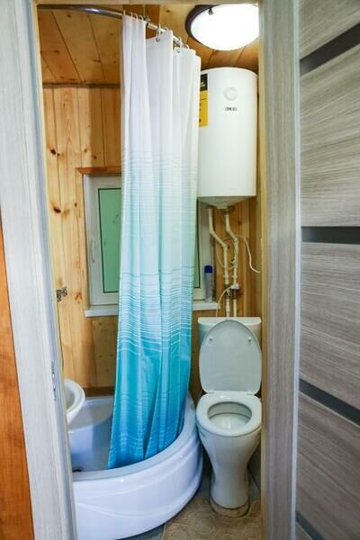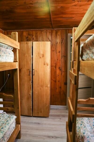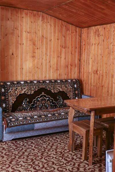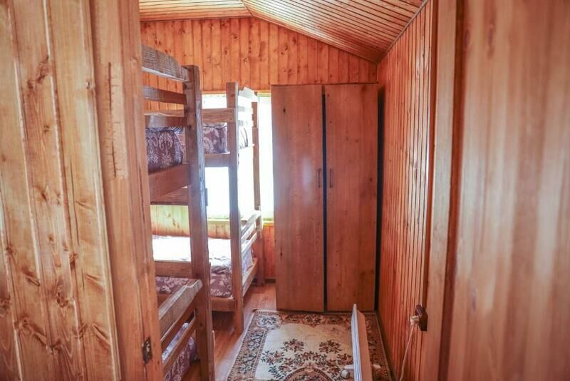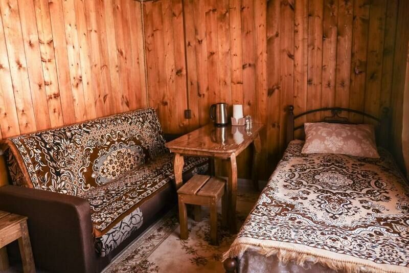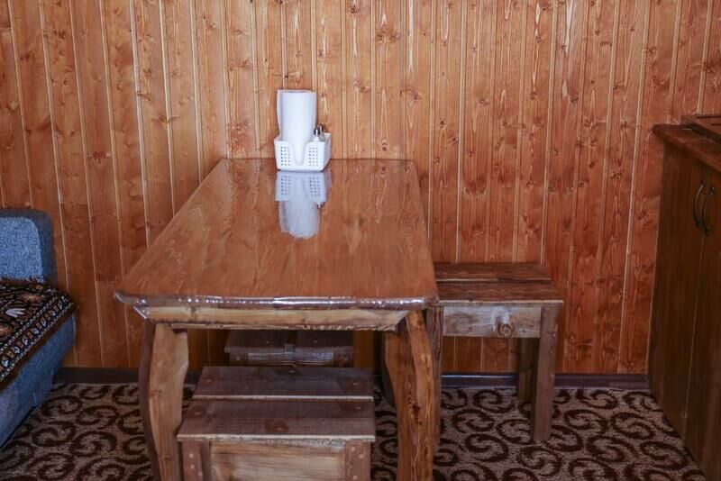 - В каждом домике — собственная ванная комната, мини-кухня с электроплиткой и чайником, спальня с двухъярусными кроватями и гостиная зона для комфортного отдыха.