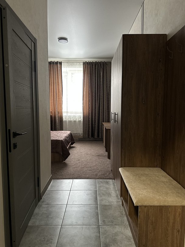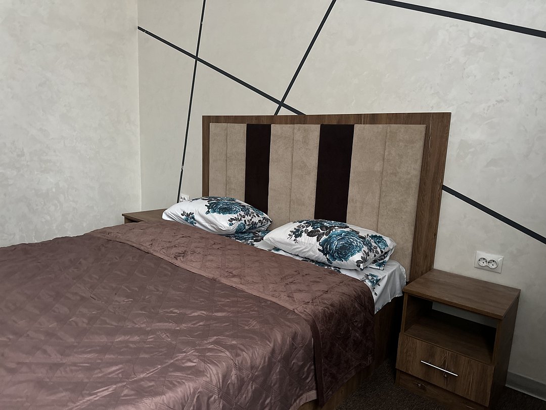 В доме оборудовано шесть просторных номеров, каждый из которых включает двуспальную кровать, вместительный шкаф, собственный холодильник, чайник и индивидуальный санузел. Особенность размещения — персональная мангальная зона прямо на территории, где можно готовить на свежем воздухе.