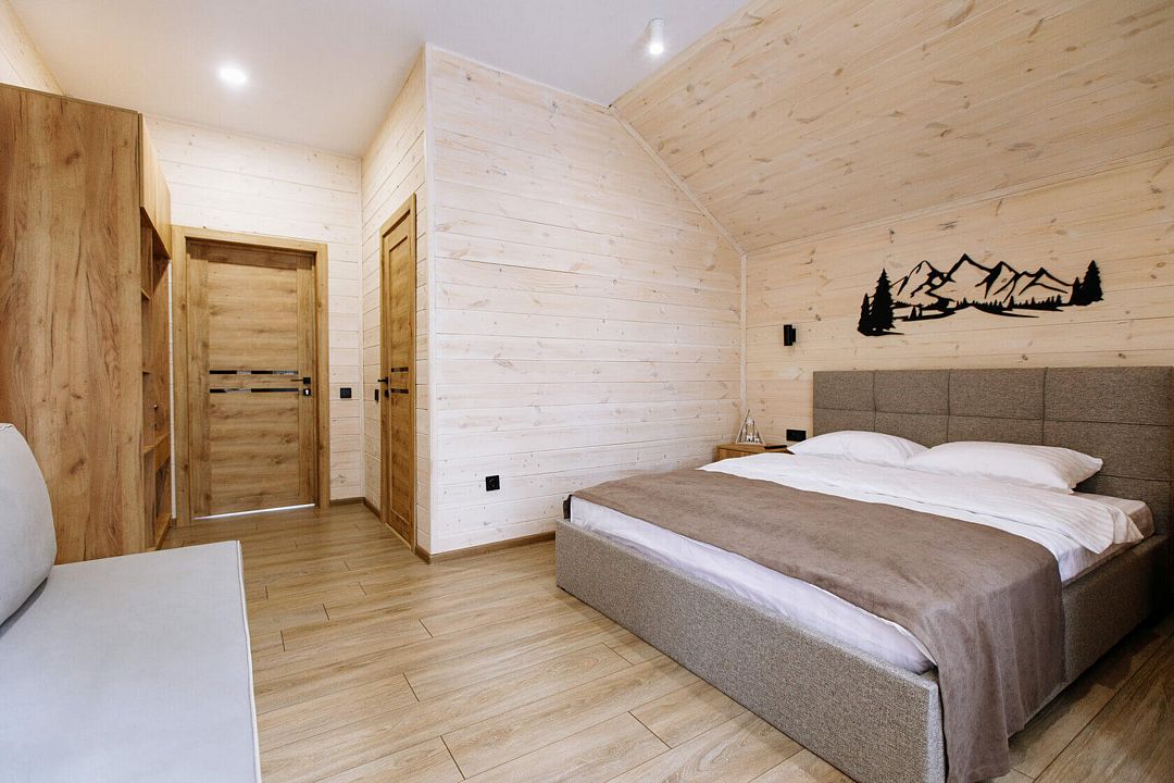 Большой комфортный четырехкомнатный коттедж, рассчитанный на проживание до шестнадцати человек. В комнатах размещены четыре двуспальные кровати и четыре двуспальных дивана.