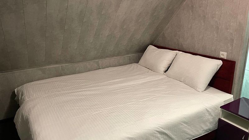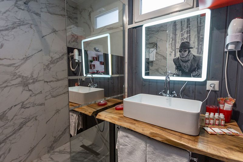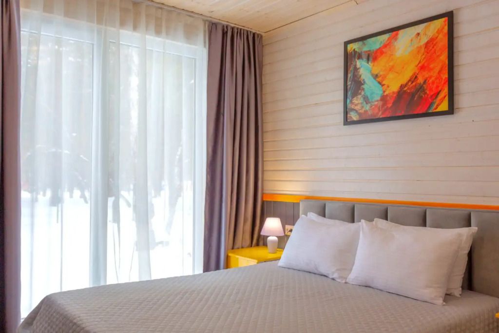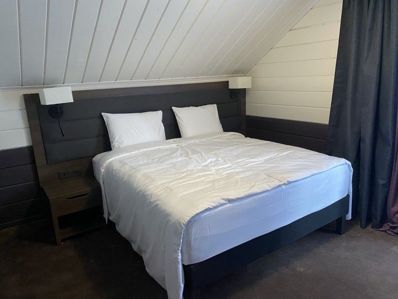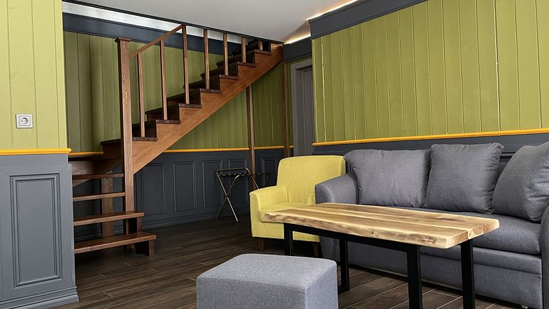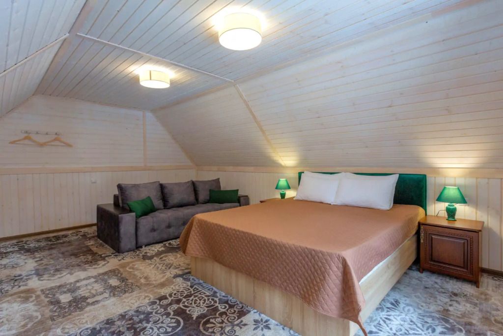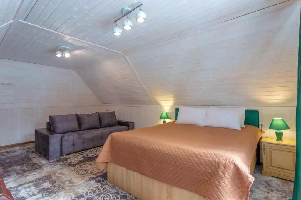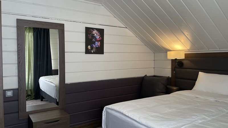 На втором этаже здания находятся две изолированные дизайнерские спальни, с огромными кроватями размера King size, часть которых делится на две отдельные постели, и мягкой софой, являющейся дополнительным местом размещения. Через панорамные окна видно горы и лес, а ночью из постели можно наблюдать за звездным небом. Также на втором этаже есть дополнительный санузел, с просторной душевой кабиной, оснащенный полным комплектом текстиля и косметики.