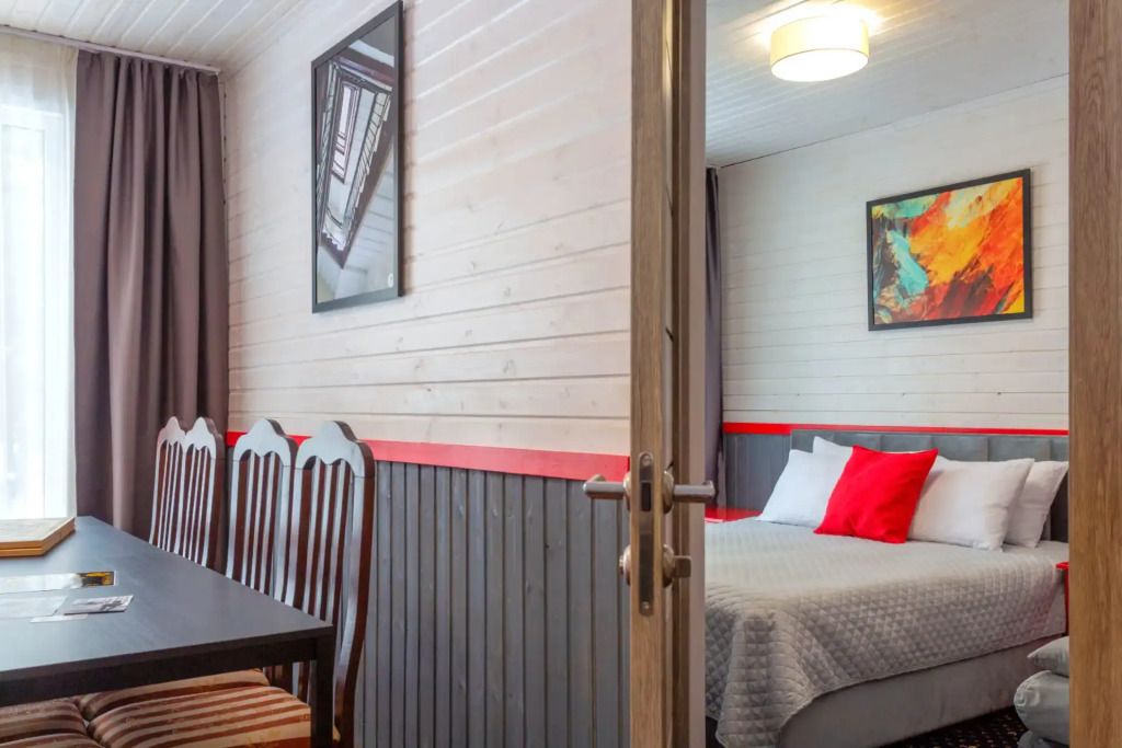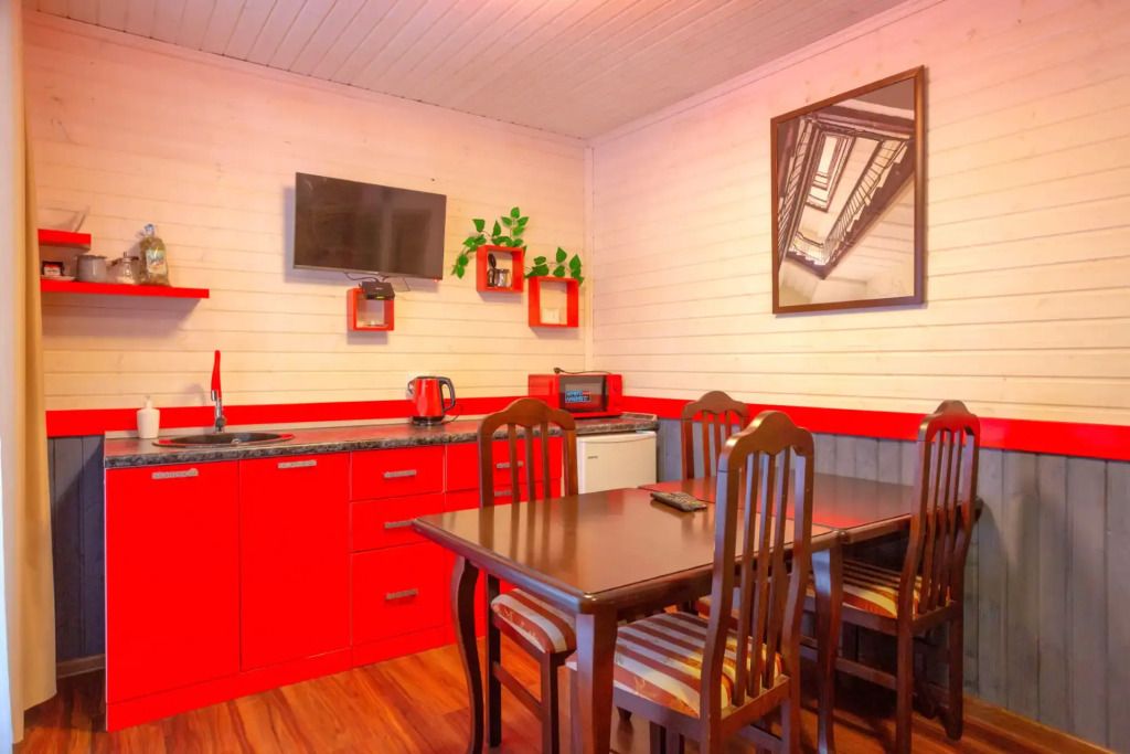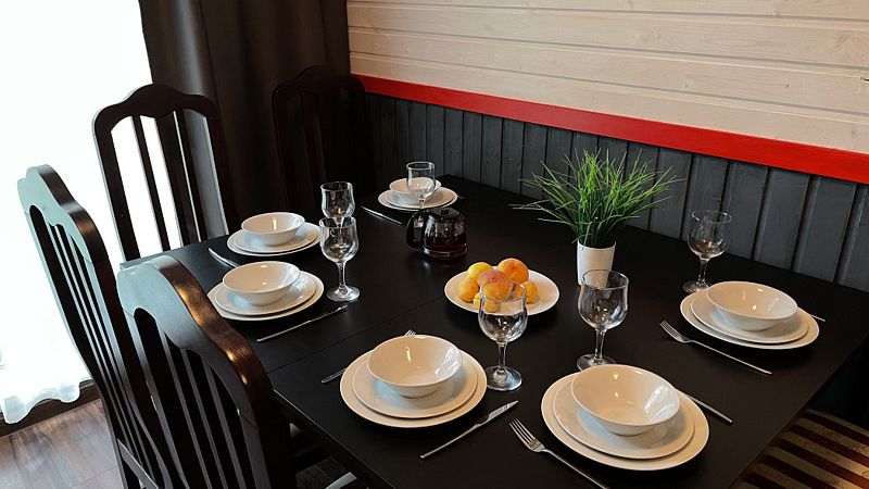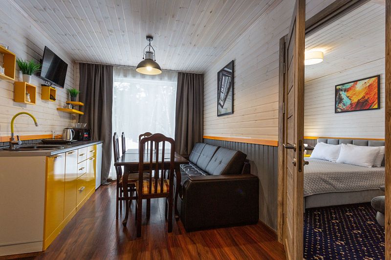В уютных домах категории Suite, в распоряжении гостей парк-отеля имеется современная кухня с обеденной зоной, оснащенная столовой посудой на 5 персон, холодильником, микроволновой печью и электрическим чайником.