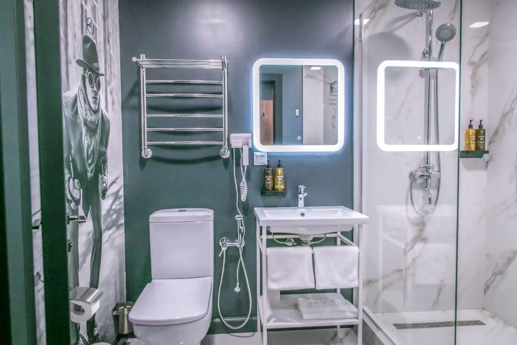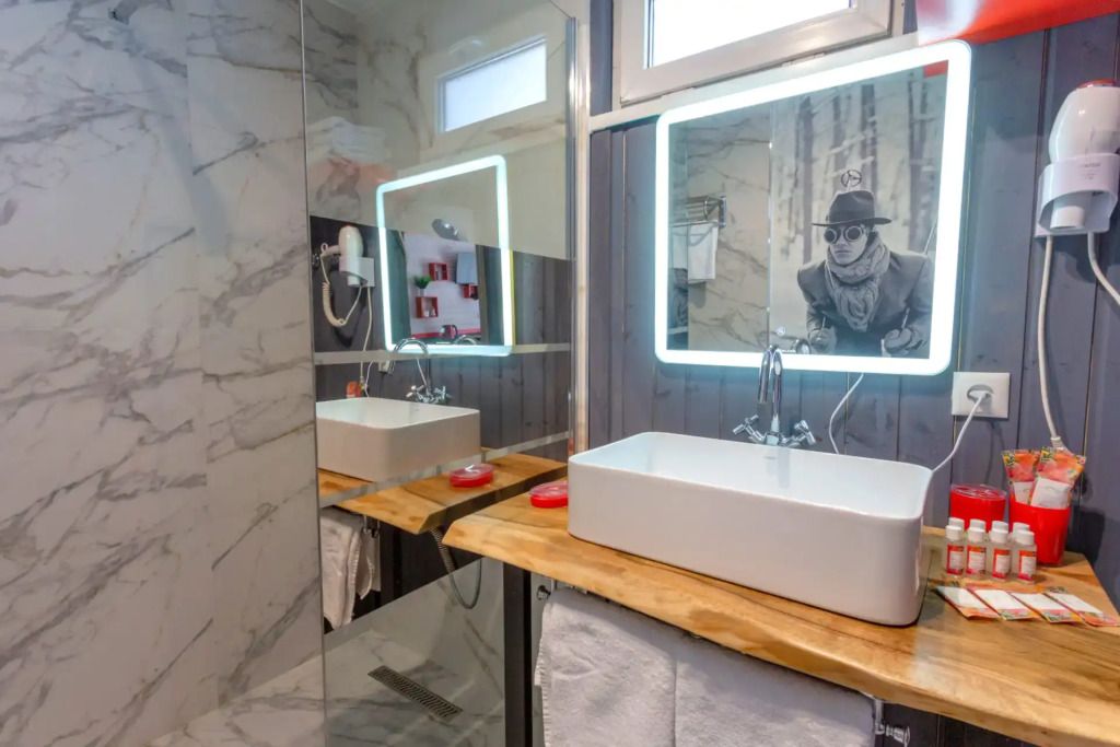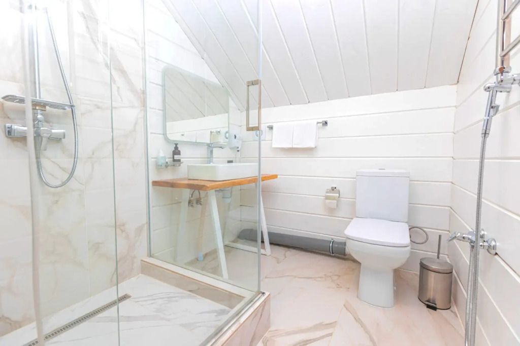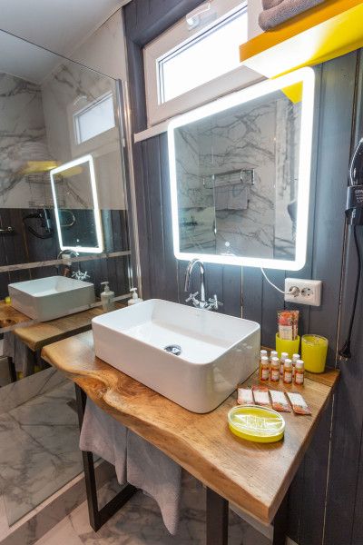 Также на первом этаже дома расположен санузел , в котором вы найдете полный комплект полотенец, фен, широкое зеркало с подсветкой и высококлассную органическую косметику из коллекции Arganica, на 100% изготовленной из биоразлагаемых материалов – что является нашим вкладом в сохранение окружающей среды.