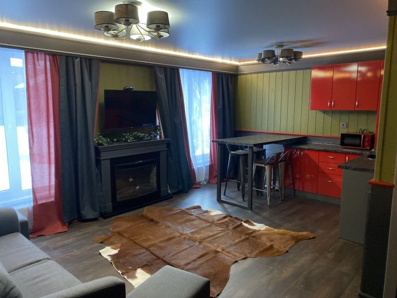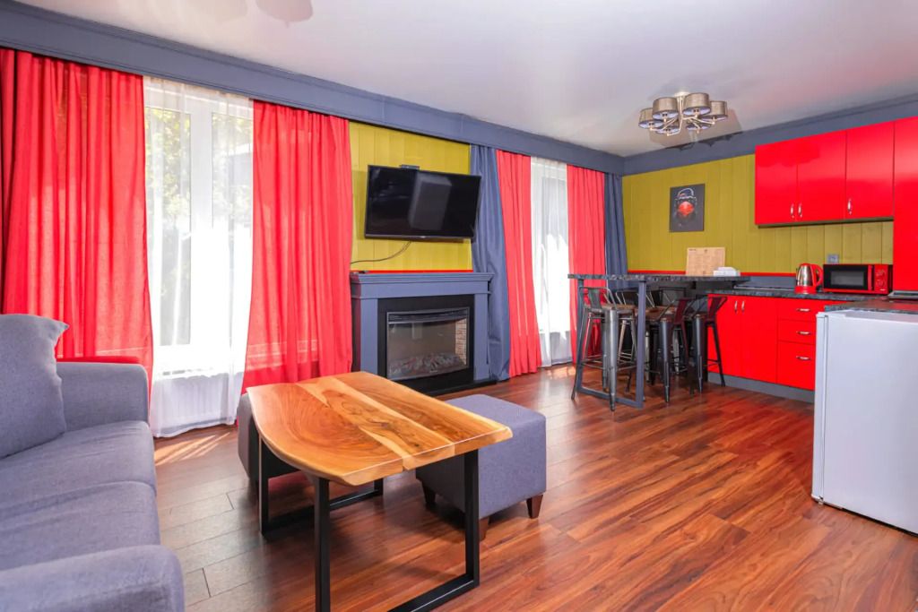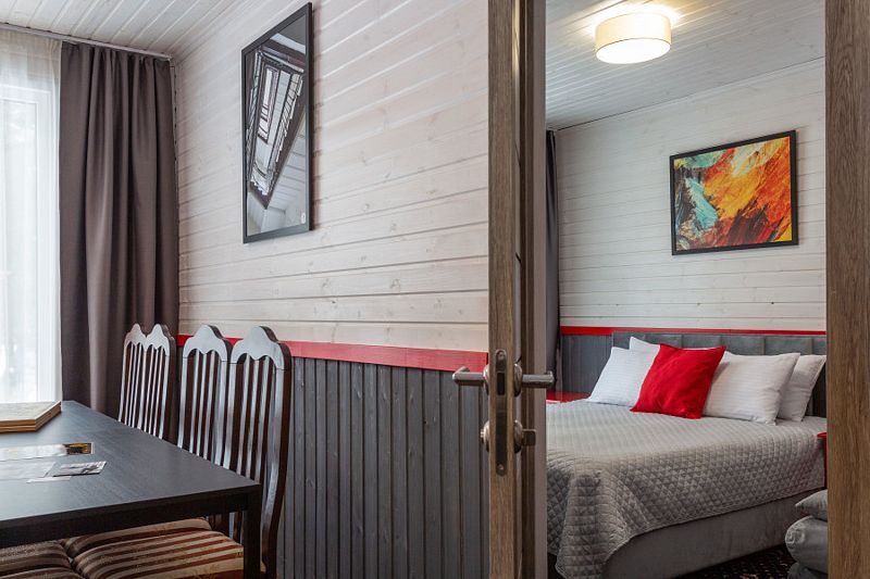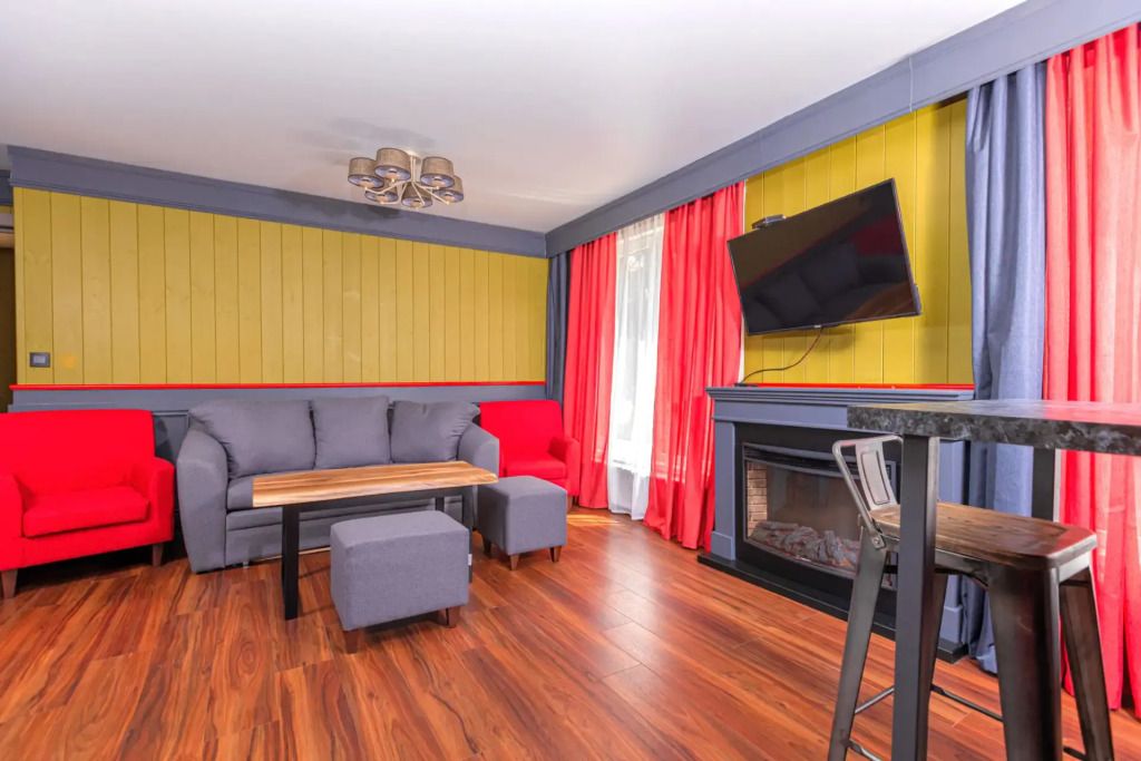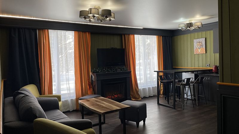 В просторной гостиной создает уют современный электрический камин с эффектами живого пламени, а мягкая зона с журнальным столиком приглашает к неспешным посиделкам с друзьями и родными. Кухонная зона традиционно для парк-отеля Sun Village Arkhyz оснащена полным комплектом столовой посуды, холодильником, микроволновой печью и электрическим чайником, а обеденная зона со столом-стойкой прекрасно подходит для семейного обеда.