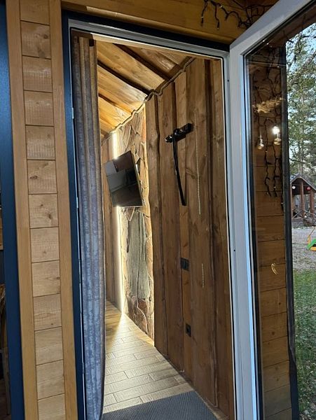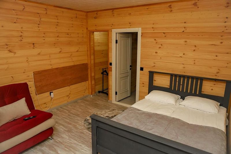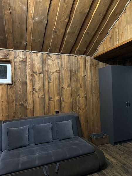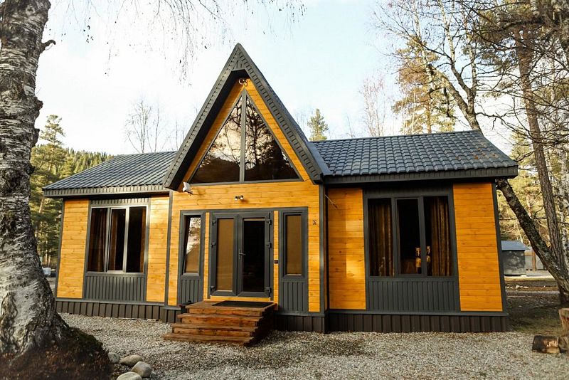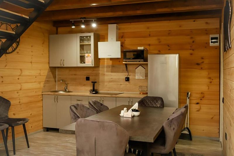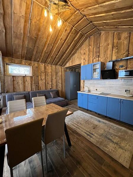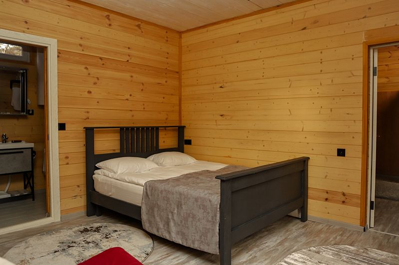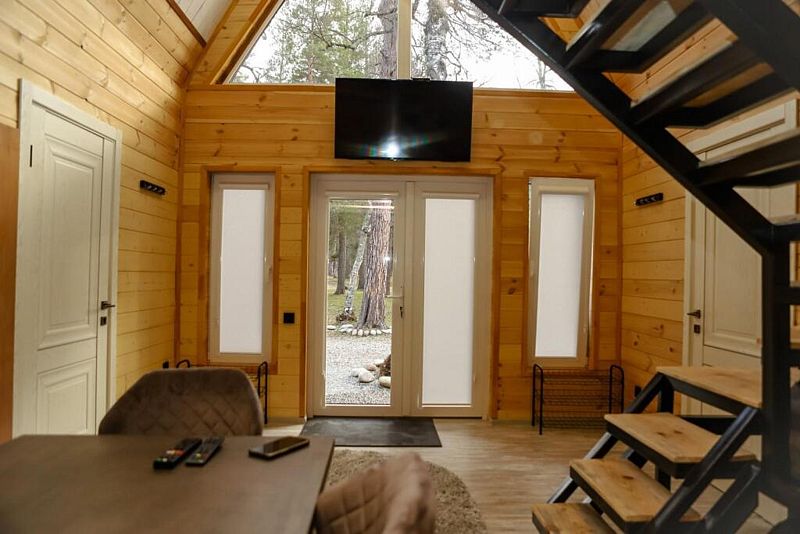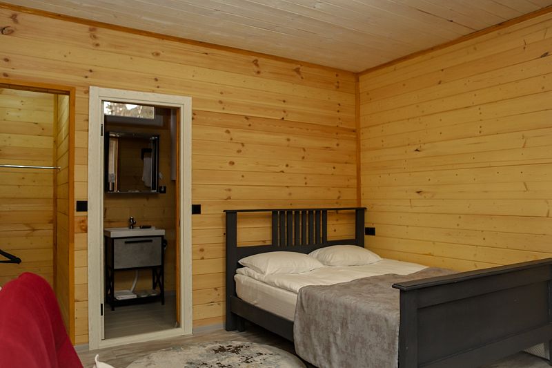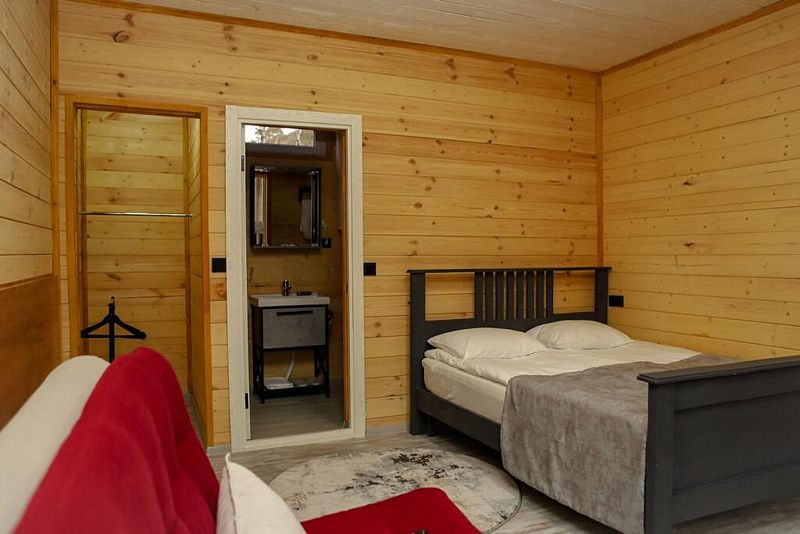 Двухкомнатный дом в эко-стиле, обшитый натуральным деревом, доступен для проживания четырех гостей, со спальней и кухней-гостиной.