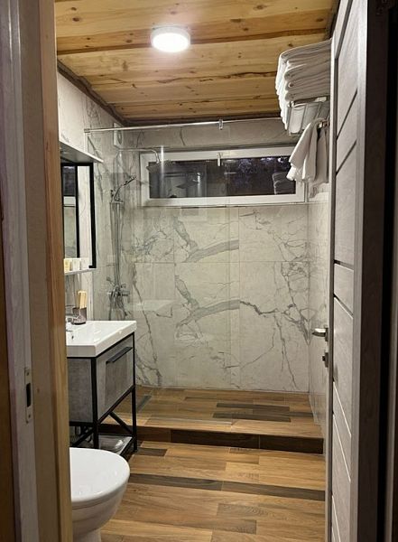 Шале класса люкс предлагает комфортное проживание, каждый домик рассчитан на пятерых гостей. Шале оборудовано мангальной зоной, уличным камином, детской площадкой и беседкой.