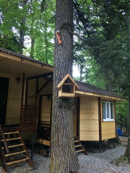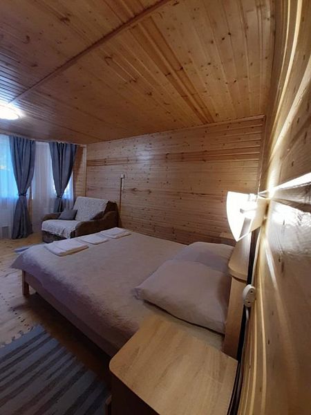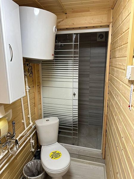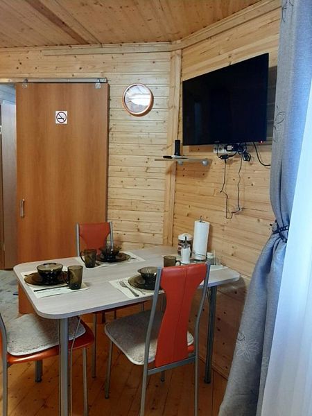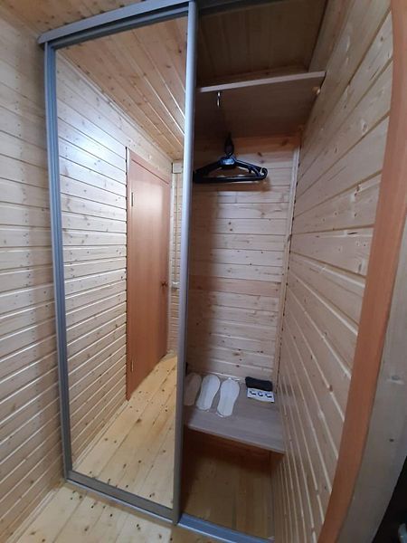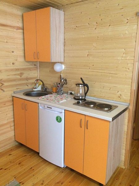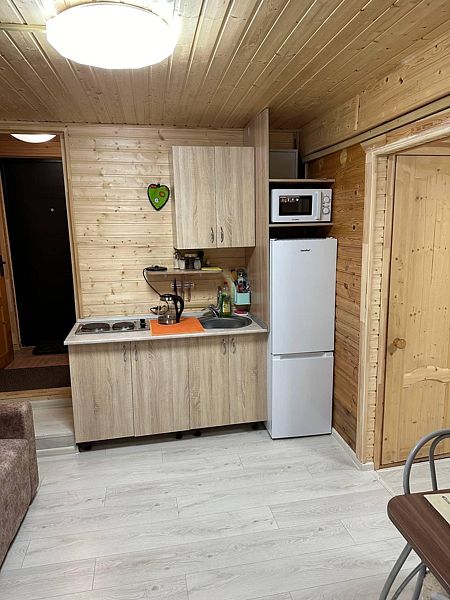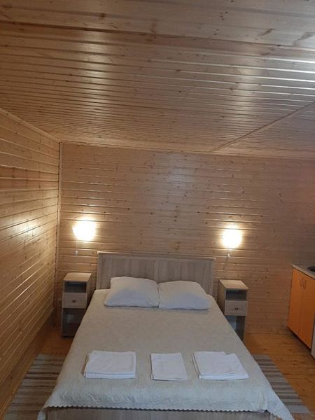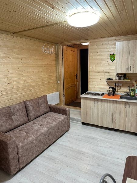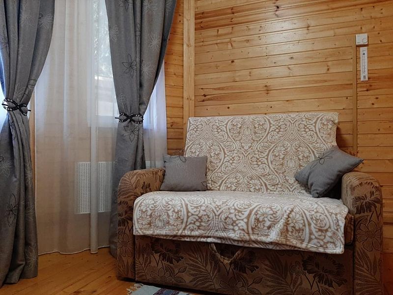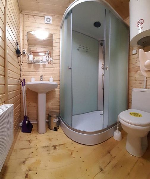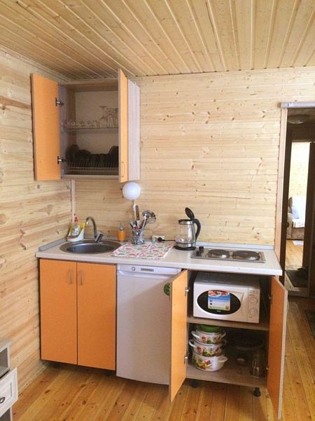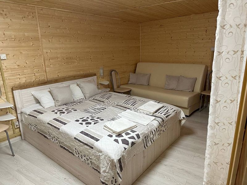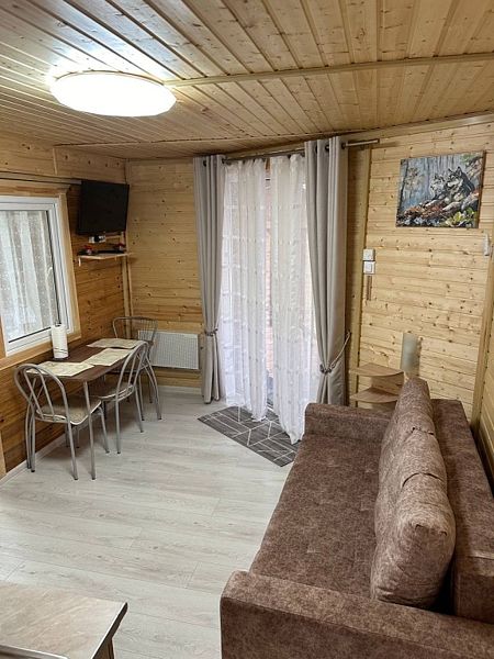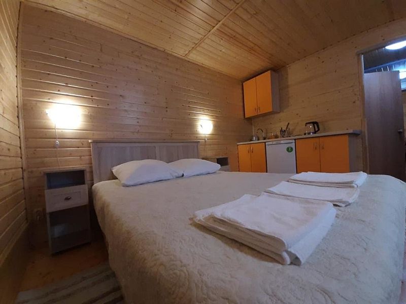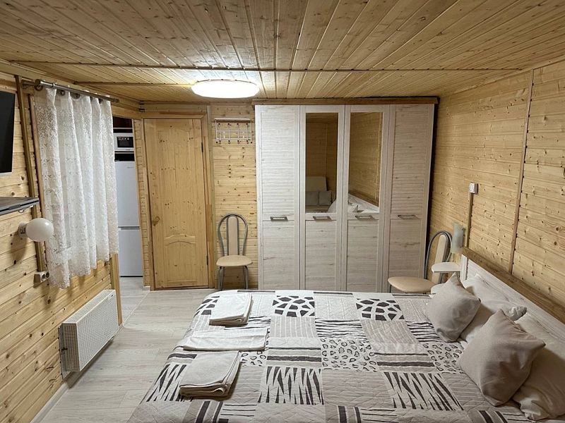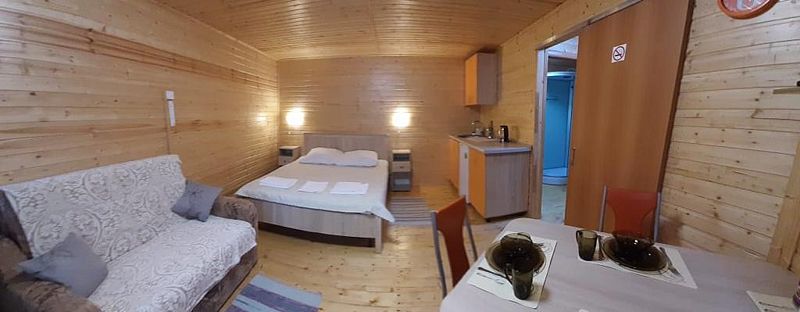 - зеркало во весь рост, вешалки, щетка для одежды, салфетки для обуви. Жилая комната 25 кВ.м. В жилой комнате двух спальная кровать, прикроватные тумбочки, бра, раздвижной диван со спальным местом 110см. х 200см. обеденный стол, три стула, чайник, микроволновая печь, телевизор с плоским экраном 81 диагональ, мини кухня с мойкой, варочная панель, посуда из расчета на четыре человека. Санузел, душевая кабина размером 120х 80, раковина, зеркало, фен, унитаз, освежитель воздуха, бойлер на 100 литров, имеется в каждом домике. Горячая, холодная вода круглосуточно. Постельные принадлежности, полотенца, тапочки, туалетная бумага предоставляются.