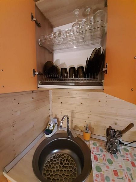 - первая комната сделана студией, где имеется кухня, посуда из расчета на шесть человек, чайник, холодильник, микроволновая печь, стол, стулья, телевизор, раздвижной диван, бра, прикроватная полочка;
