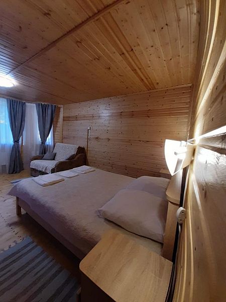 Семейный отдыхДостоинстваНебольшая территория,выходит в лес .Тишина и уют ,на территории своя банька .Вежливое и внимательное отношение.Домик хороший ,тёплый ,есть всё необходимое .И очень приятный ценник по сравнению с другими отелями .Вообщем ,для тех ,кто хочет отдохнуть от городской суеты и не переплачивать!Спасибо !