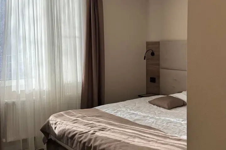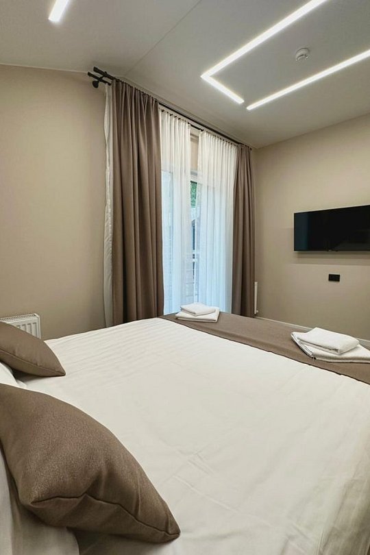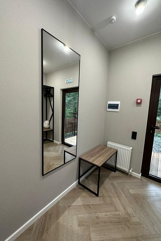 Среди удобств — четыре стильные спальни в современном стиле «лофт», каждая из которых оснащена собственной ванной комнатой, что обеспечивает полный комфорт и приватность для всех. Две спальни имеют выход на балкон, откуда открываются живописные пейзажи. Домик оборудован телевизором с доступом в интернет, что делает пребывание еще более приятным.