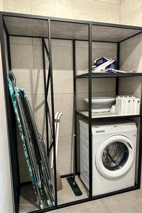 На кухне есть всё необходимое: холодильник, микроволновая печь, индукционная плита, посудомоечная машина, стиральная машина, а также посуда и все для комфортного проживания.