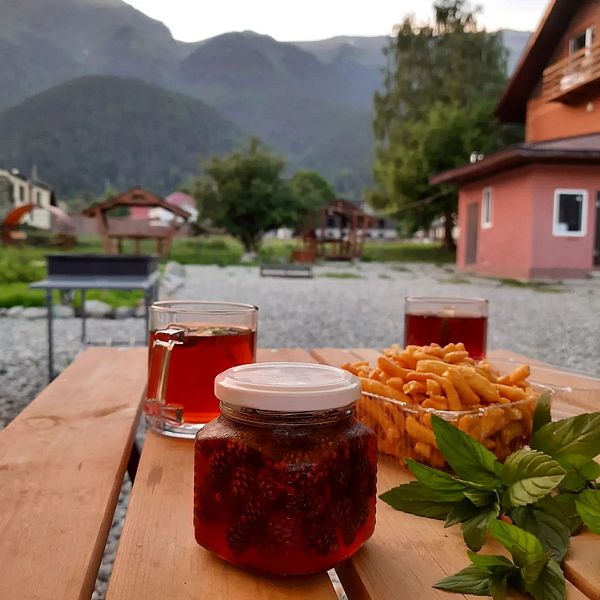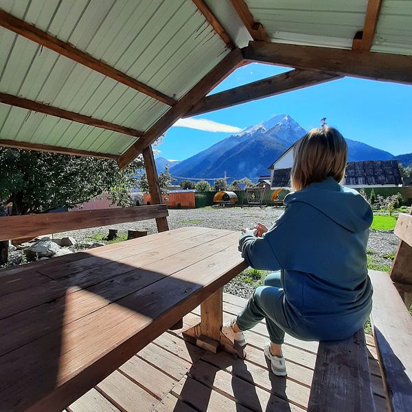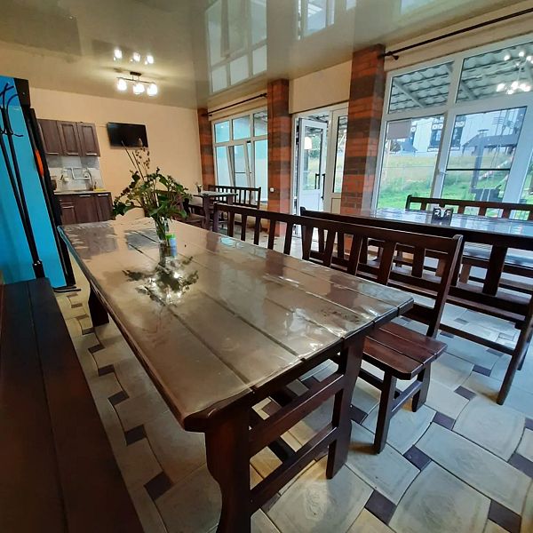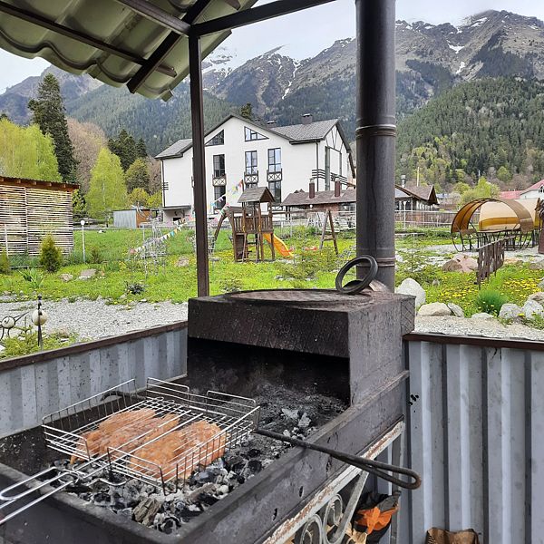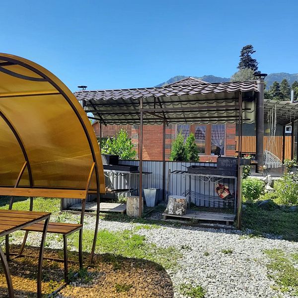 На территории гостевого дома вы найдете уютную крытую беседку, оснащенную кухонным и обеденным пространством. В горах погода может меняться очень быстро: солнечные дни порой уступают место дождливым, и в такие моменты беседка станет идеальным укрытием, где вы сможете насладиться едой в комфортной обстановке.