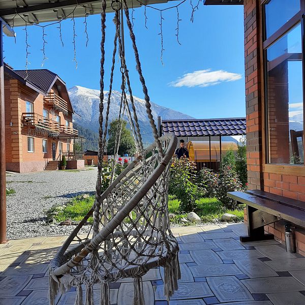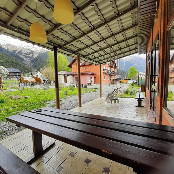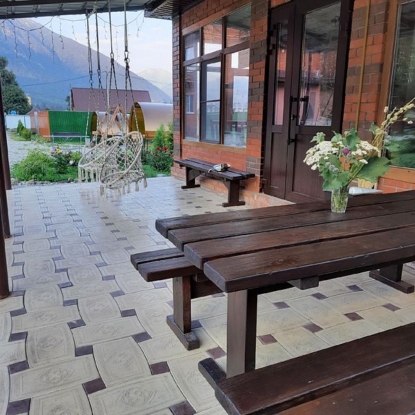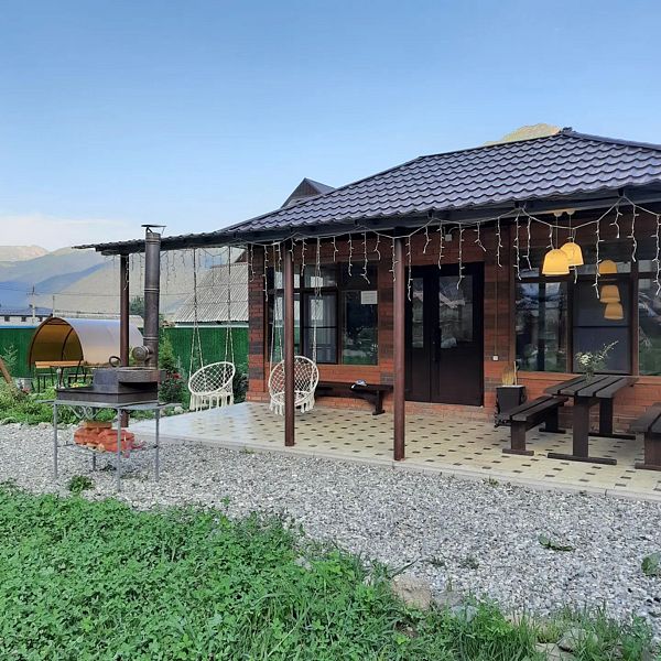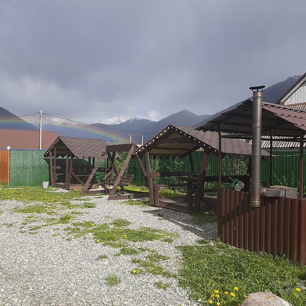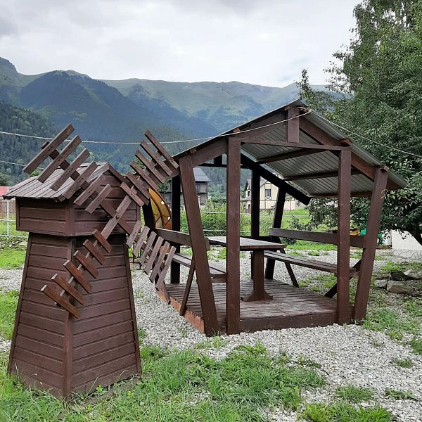 На территории гостевого дома вас ждет уютная крытая беседка, оборудованная всем необходимым для приятного времяпрепровождения: кухонным и обеденным пространством, а также подвесными креслами и скамейкой со столом для комфортного отдыха. Погода в горах может быть капризной, но не беда! В случае дождя беседка станет отличной защитой, позволяя вам наслаждаться едой в уютной обстановке.