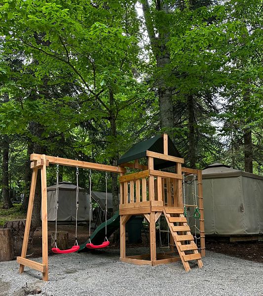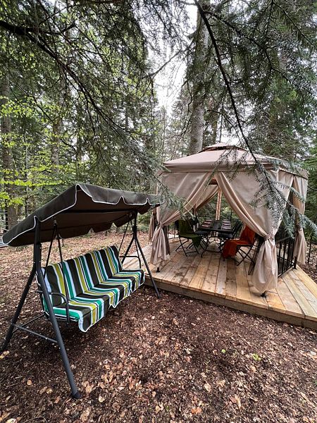 Для тех, кто предпочитает уединение, доступны отдельные коттеджи, подходящие для больших компаний. К услугам отдыхающих предлагаются Wi-Fi, мангальные зоны или комнаты для барбекю, а также открытые террасы, оборудованные мангалами для приготовления пищи на свежем воздухе. На территории также расположены детская площадка, батут, беседки и шатры, качели — все для удобного отдыха с детьми.