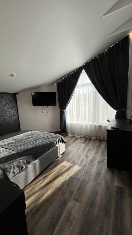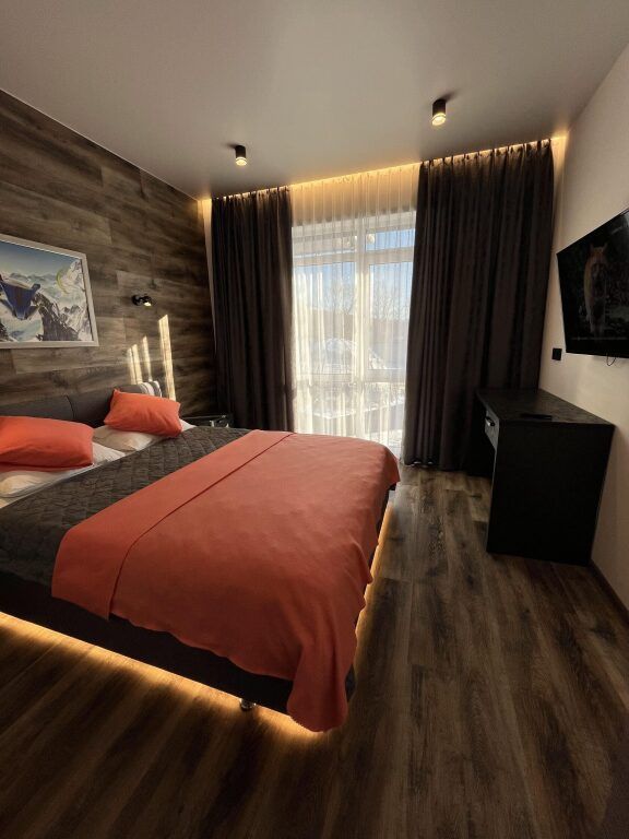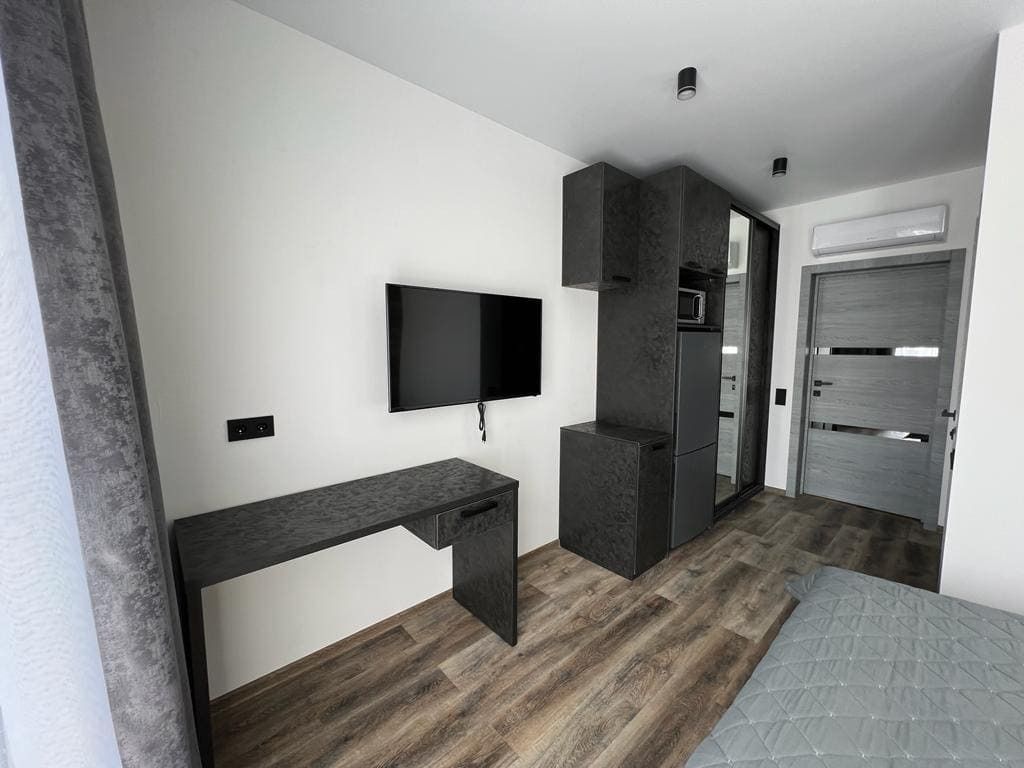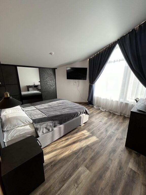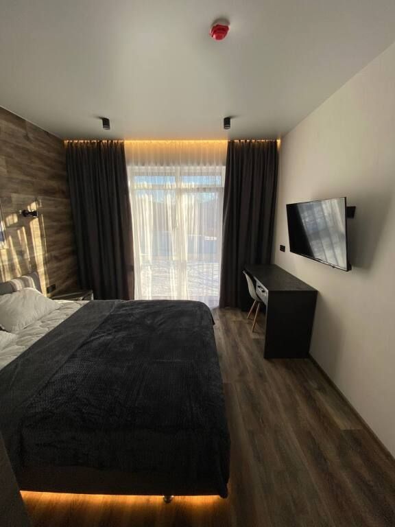 В номере: двуспальная кровать, шкаф для вещей с зеркалом, письменный стол, 2 стула, телевизор, электрический чайник, микроволновая печь, холодильник и кондиционер.