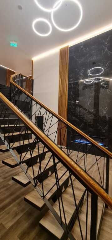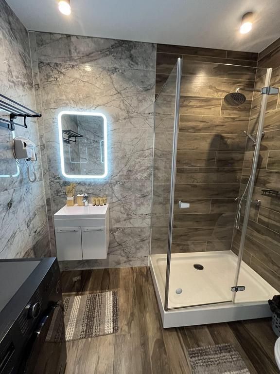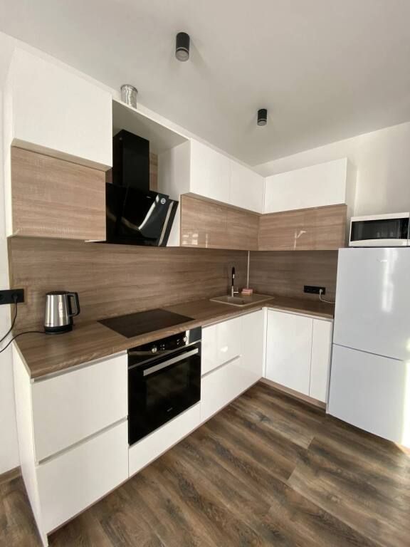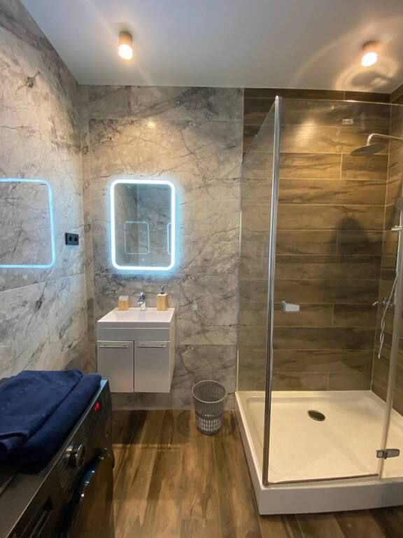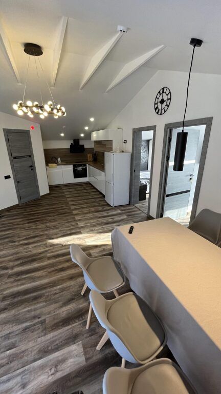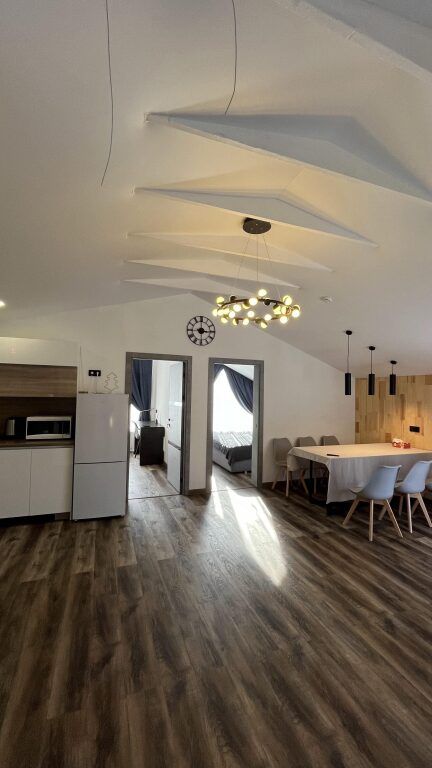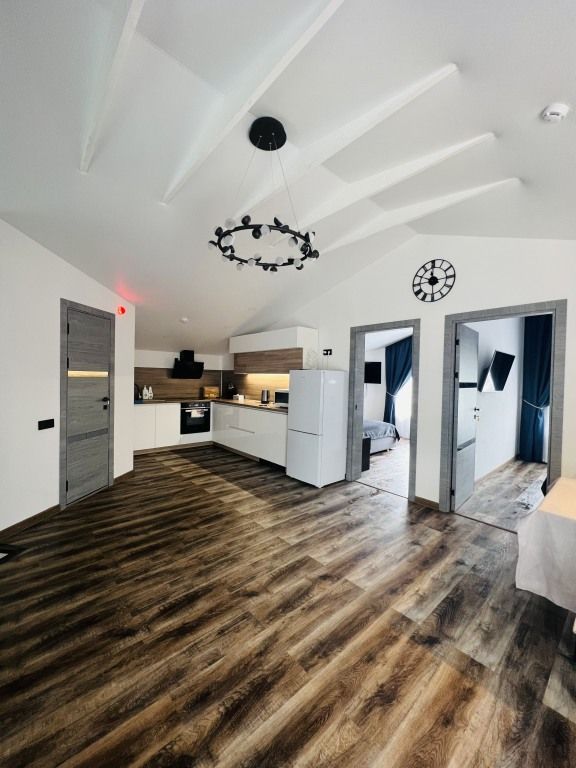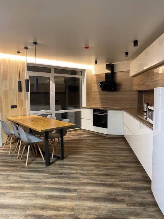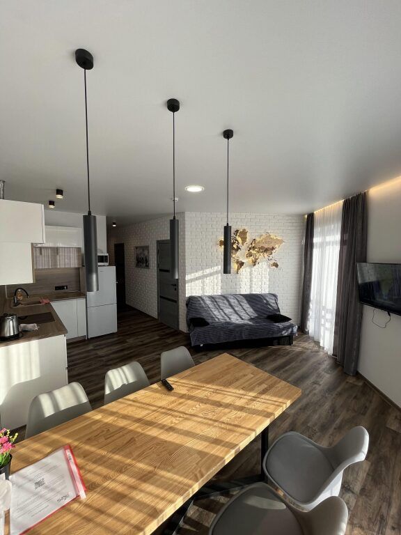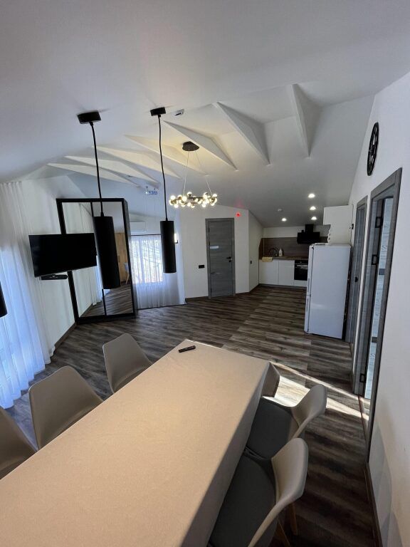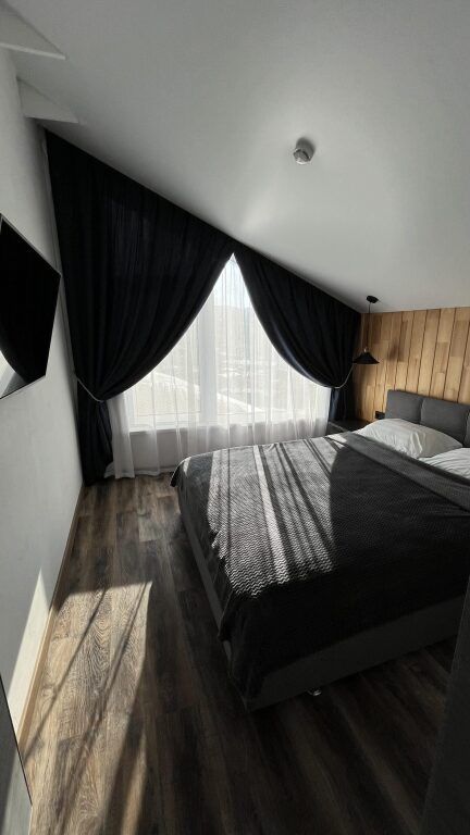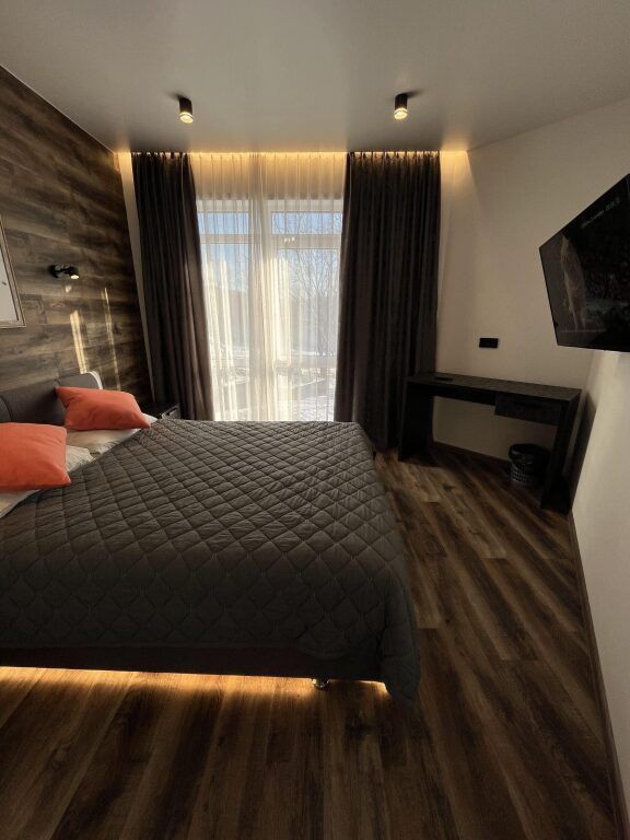 В каждой спальне: двуспальная кровать, стол, 2 стула, телевизор, прикроватные тумбы. Имеются гардеробная комната, просторный зал с кухней-столовой: обустроенная кухонная зона с электрической печью, духовым шкафом, холодильником, вытяжкой, микроволновой печью, посудомоечной машиной, стиральной машиной, чайником, посудой на 6 персон, есть телевизор, кондиционер и полутораспальный диван, подогреваемые полы.