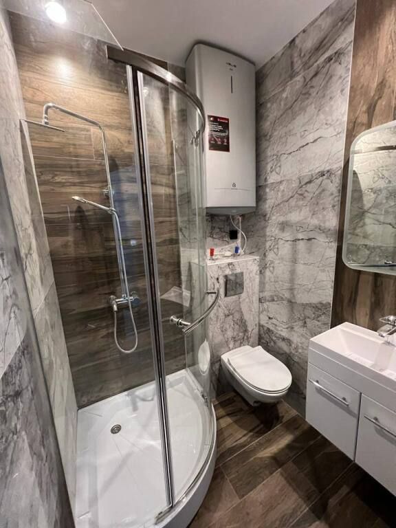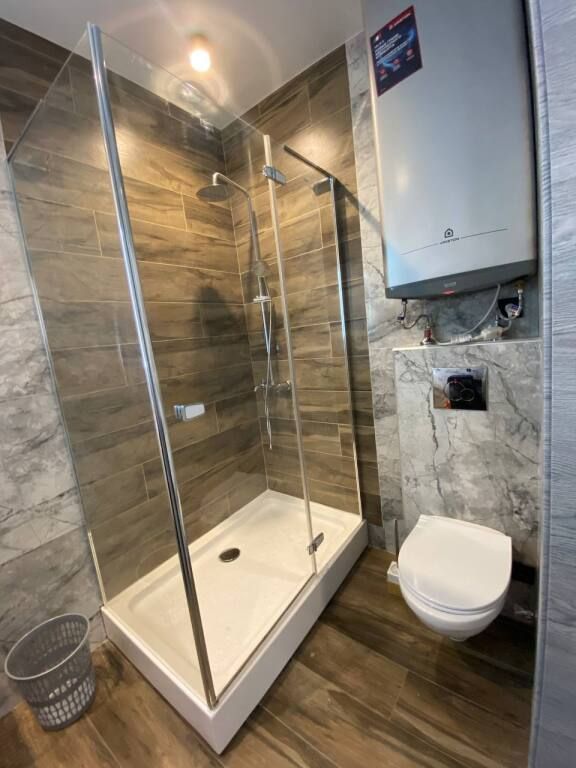 В санузле: душ, туалет, раковина, титан, фен.