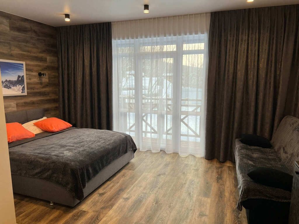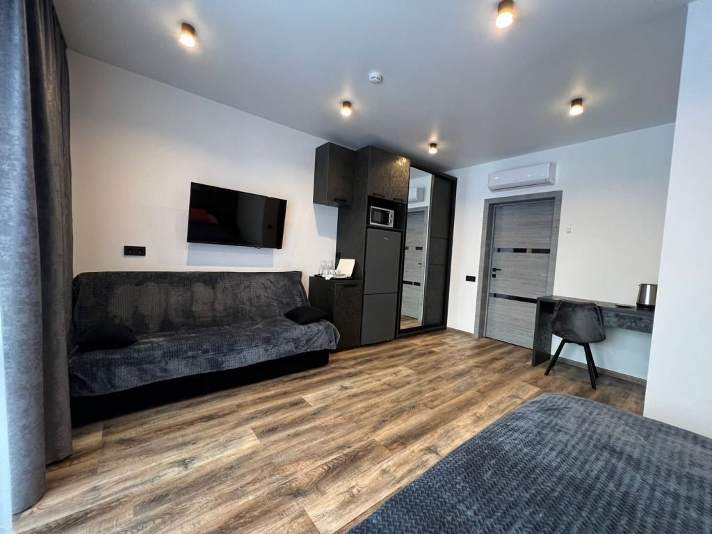 В номере: двуспальная кровать, раскладной полутораспальный диван, шкаф для вещей с зеркалом, письменный стол, 2 стула, телевизор, электрический чайник, микроволновая печь, холодильник и кондиционер.