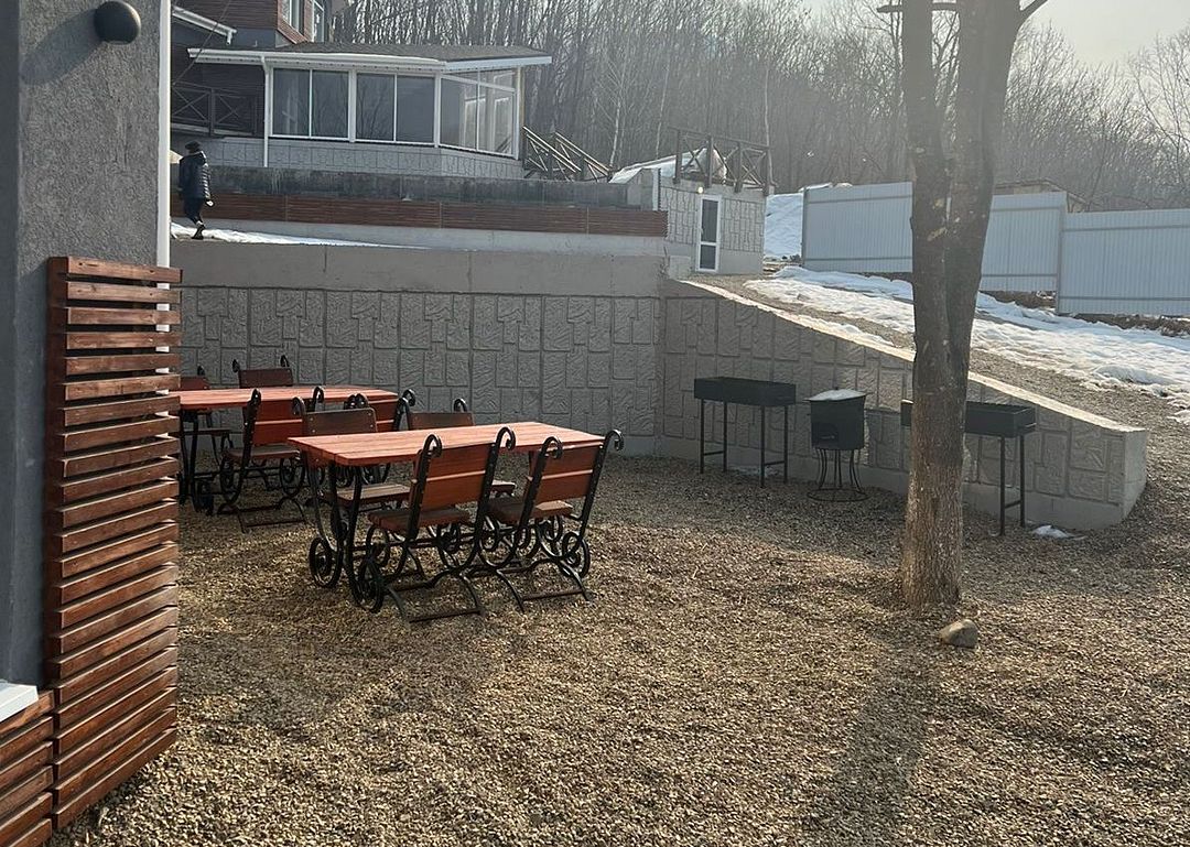 На территории гостевого дома есть мангальная зона, детские площадки, батут, парковка. Дополнительно доступны баня на дровах с бассейном и беседки, которые можно взять в аренду. Летом работает открытый бассейн с подогревом, зона с шезлонгами. Завтраки включены в стоимость проживания круглогодично.
