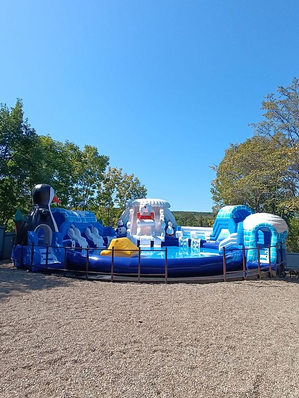 Большой бассейн с зоной отдыха и надувной водный комплекс работают с мая по октябрь под открытым небом.