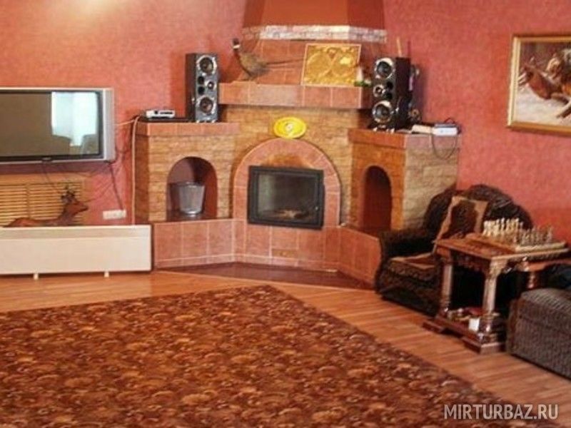 Дом-гостиница состоит из зала с камином, трех спален, кухни, просторной столовой и санузла. Кухня укомплектована холодильником, плитой, набором посуды. В санузле: раковина, ванная, душевая кабина (с холодной и горячей водой), туалет.