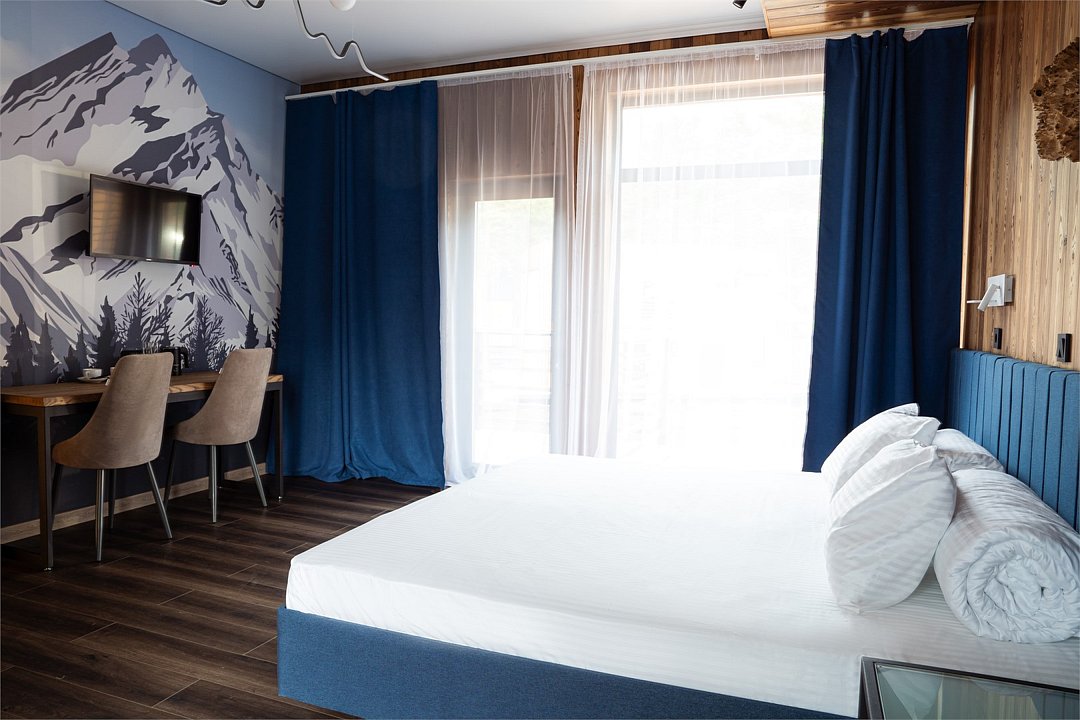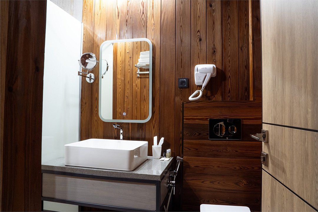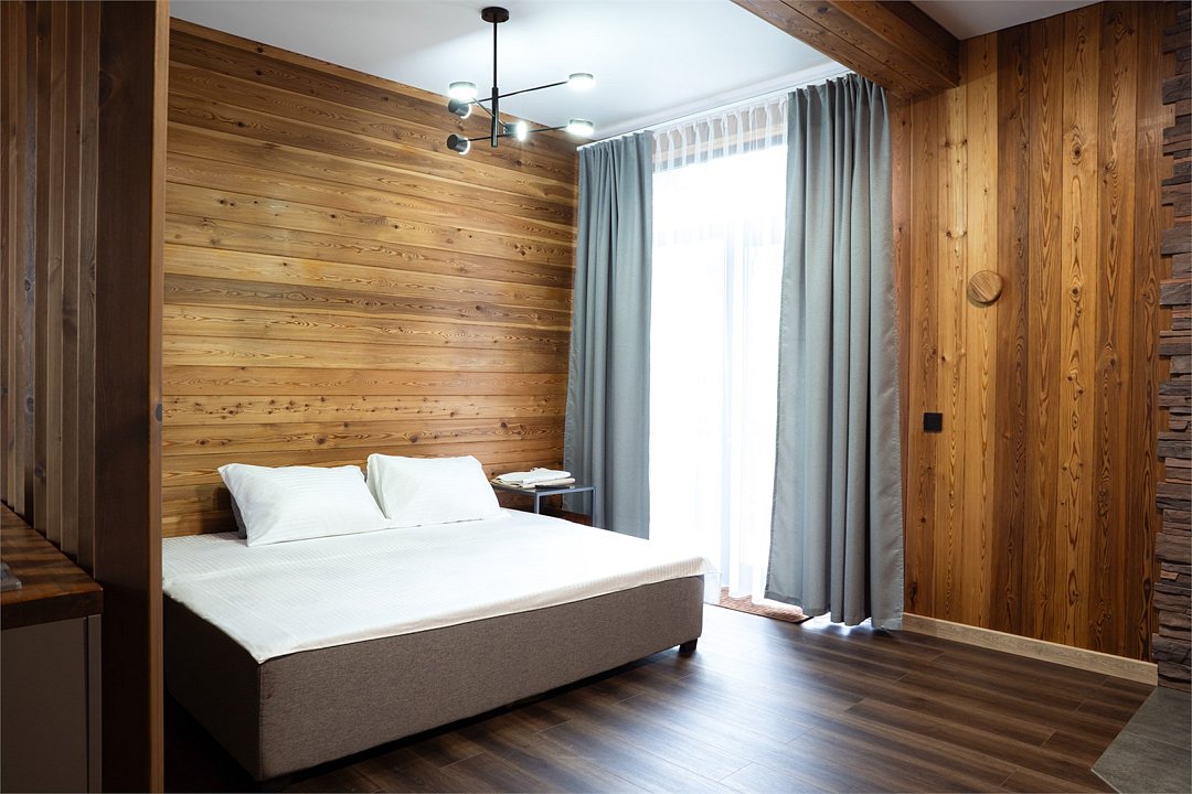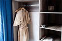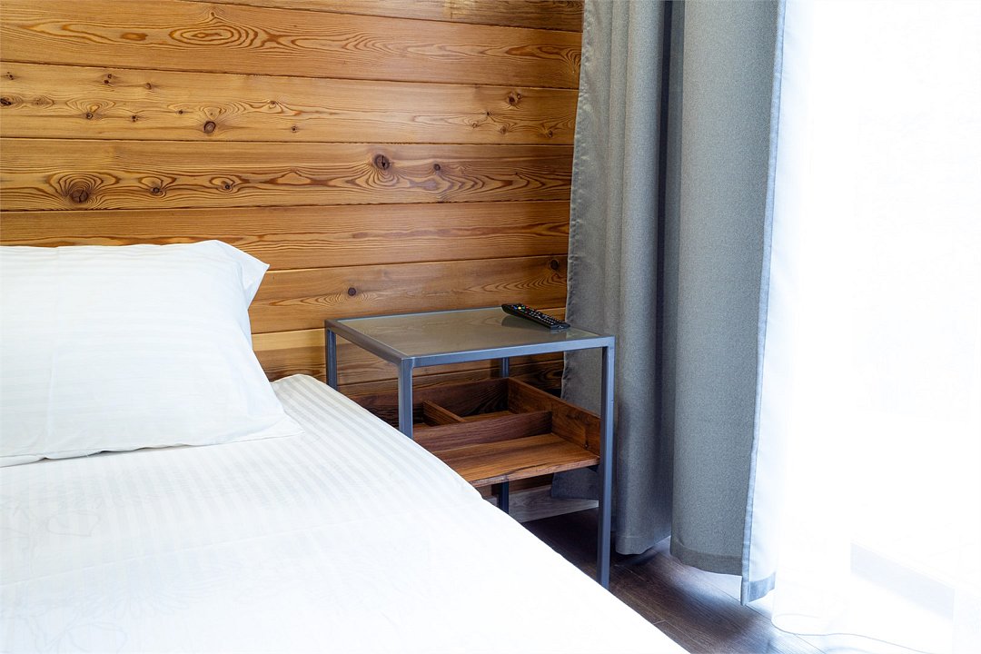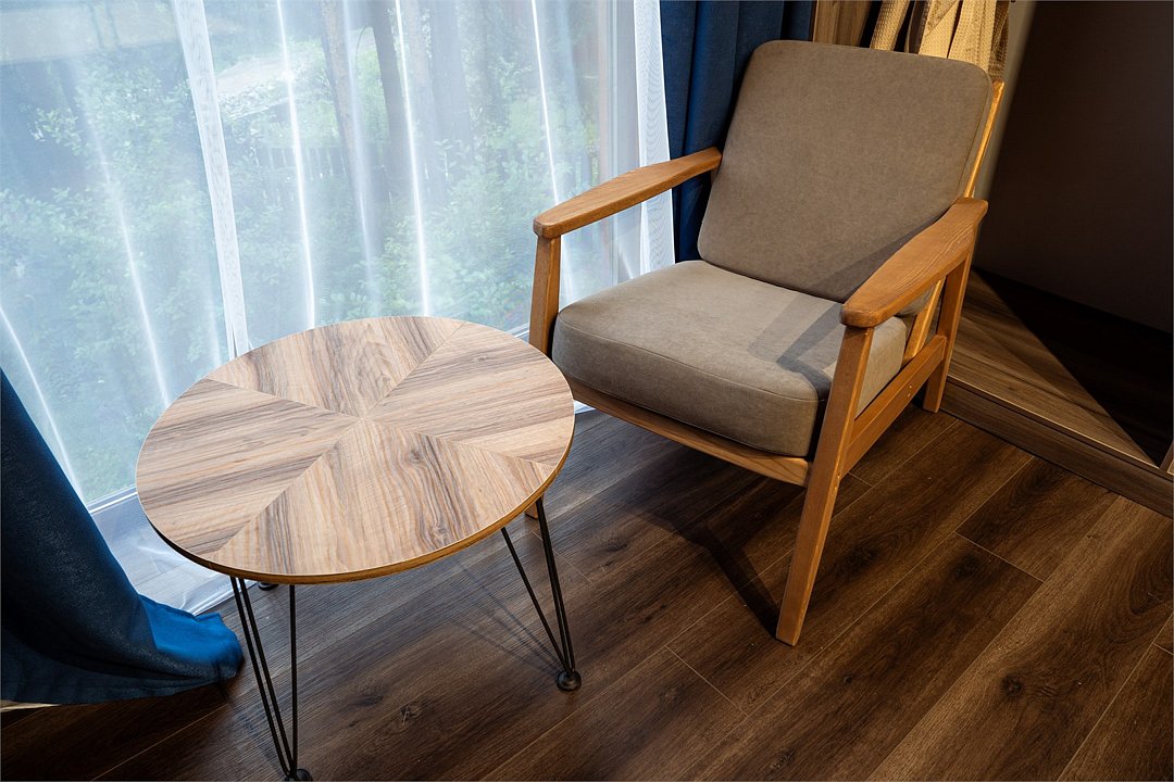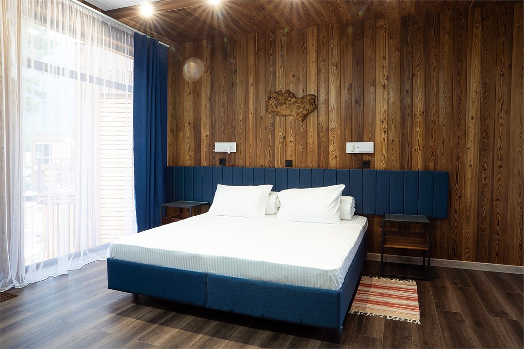 телевизор, Wi-Fi, фен, кофемашина, душевая кабина, халаты, банные полотенца, тапочки, косметические средства, терраса, две односпальные или большая двуспальная кровать, шкаф для одежды, гардеробная, вешалки, зеркало, сейф, чайник, унитаз, раковина, душ, ламинат, стул, панорамные окна, мини-холодильник, услуги прачечной (платно), мылоВ номере