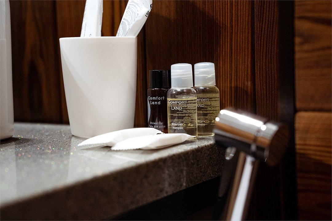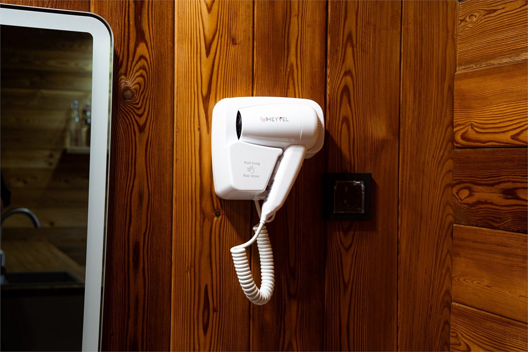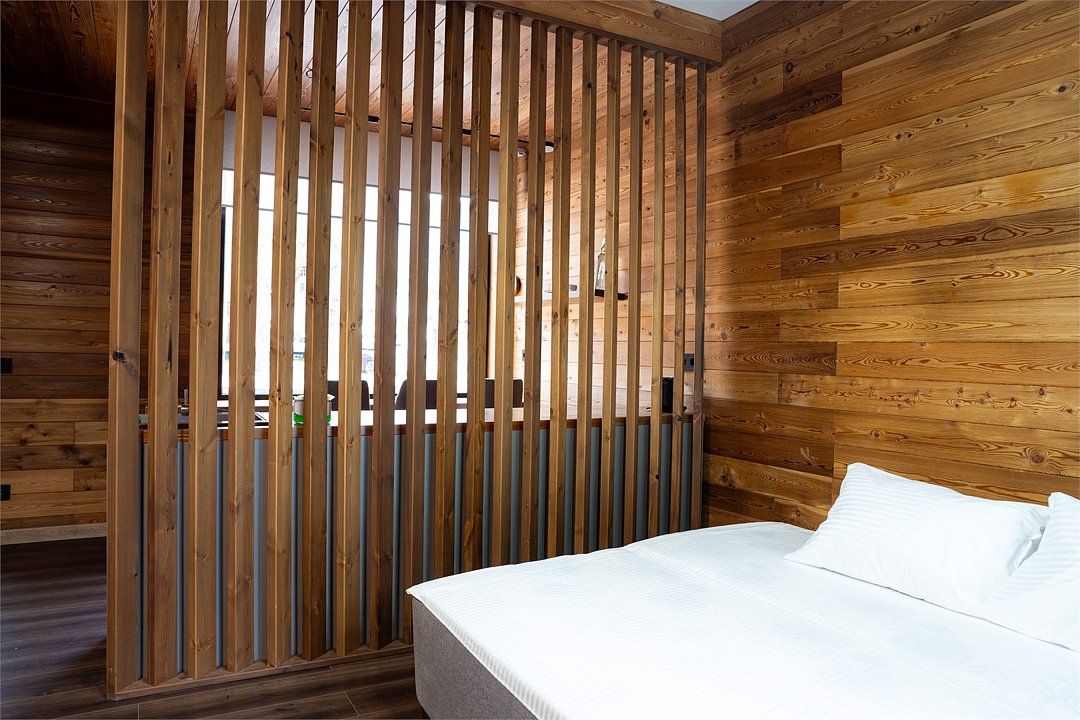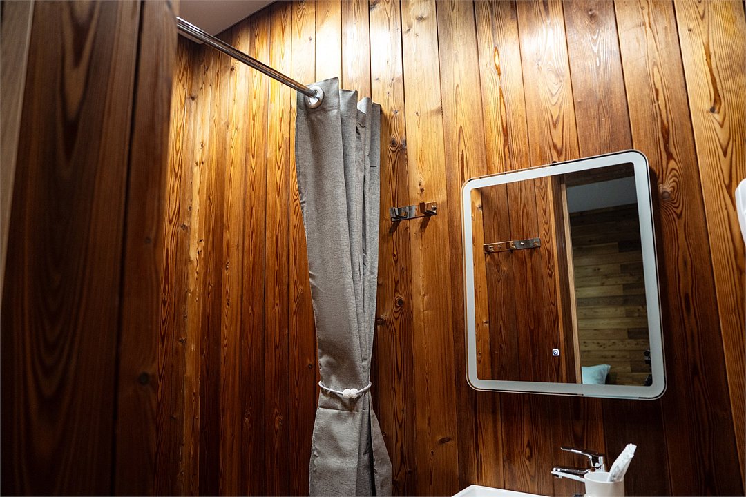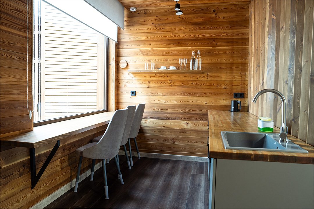 телевизор, Wi-Fi, фен, кофемашина, душевая кабина, халаты, банные полотенца, тапочки, косметические средства, терраса, две односпальные или большая двуспальная кровать, шкаф для одежды, гардеробная, вешалки, зеркало, сейф, чайник, унитаз, раковина, душ, ламинат, стул, панорамные окна, мини-холодильник, услуги прачечной (платно), мылоВ номере