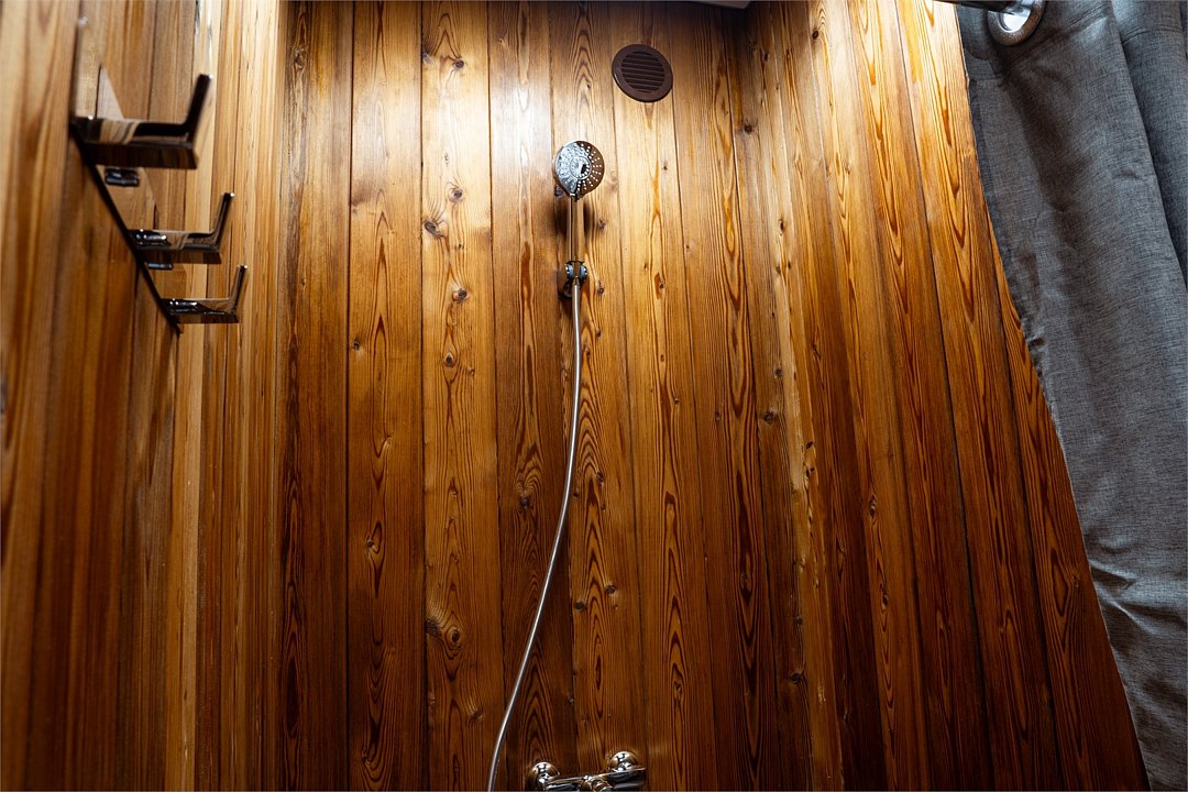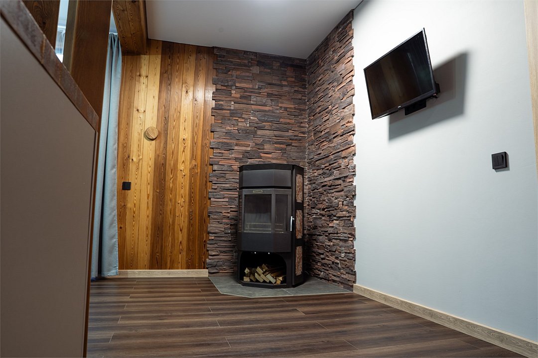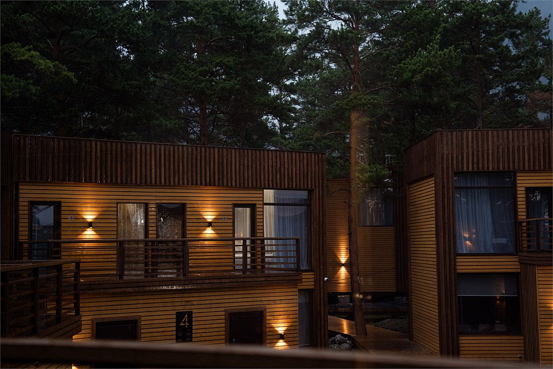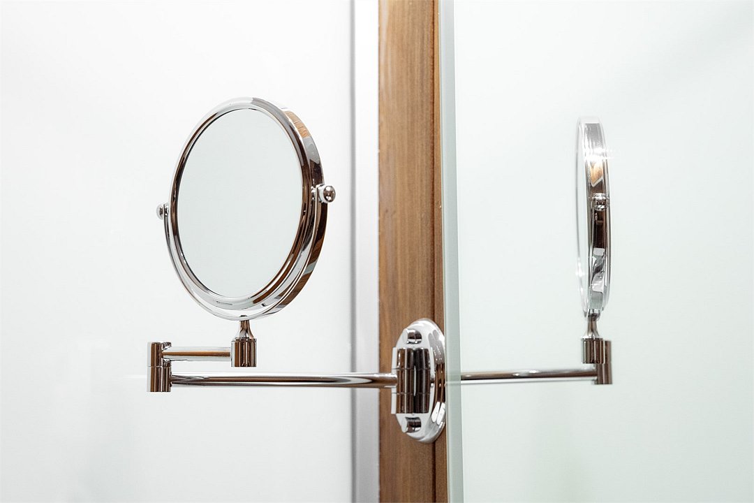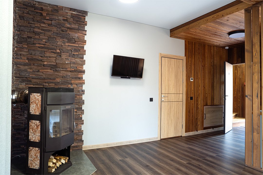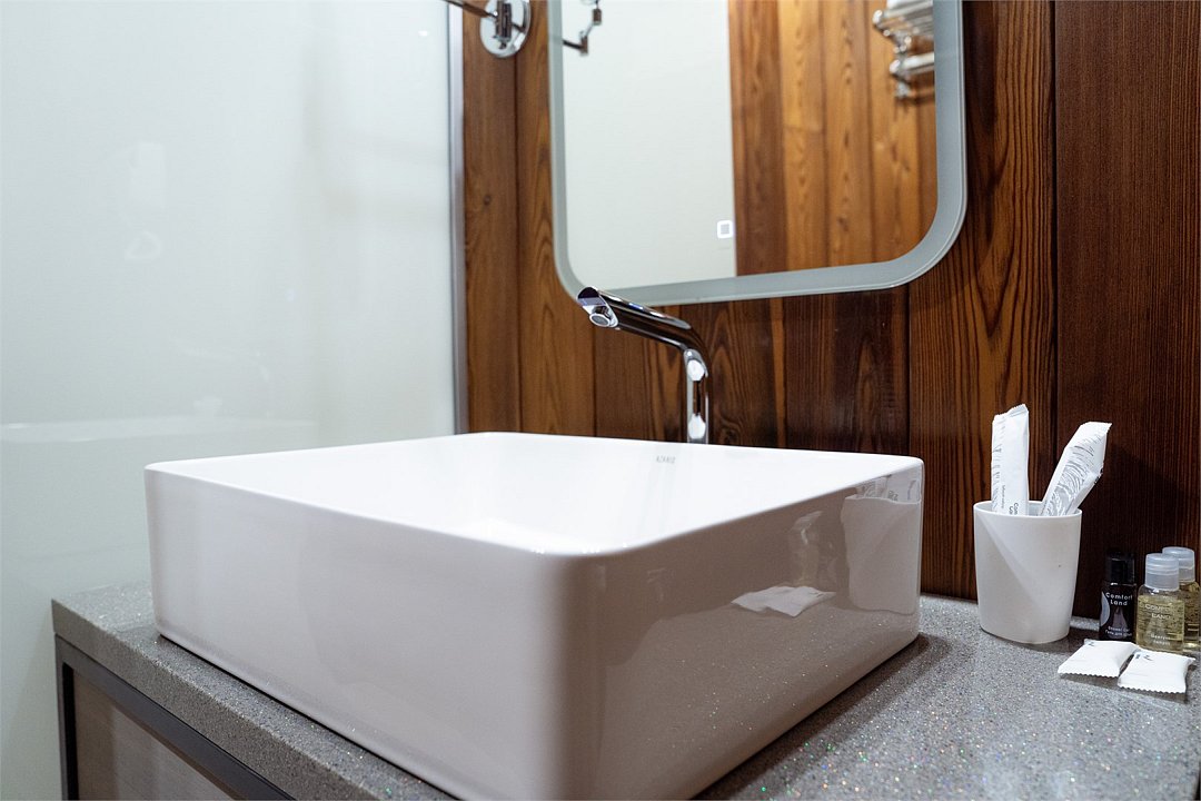 телевизор, Wi-Fi, фен, кофемашина, душевая кабина, халаты, банные полотенца, тапочки, косметические средства, терраса, две односпальные или большая двуспальная кровать, шкаф для одежды, гардеробная, вешалки, зеркало, сейф, чайник, унитаз, раковина, душ, ламинат, стул, панорамные окна, мини-холодильник, услуги прачечной (платно), мылоВ номере