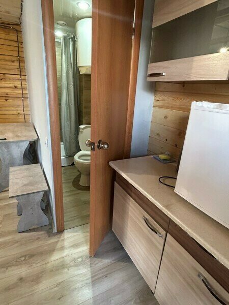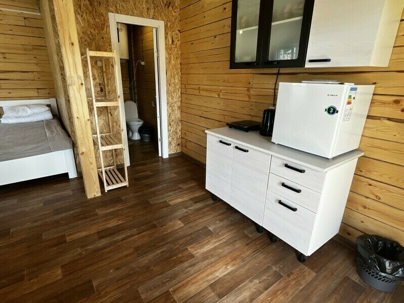 В номере есть всё необходимое для комфортного проживания и отдыха. Собственный санузел с туалетом и душем. Небольшой кухонный уголок с мини холодильником, плиткой, чайником и вся необходимая посуда.