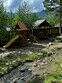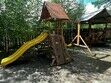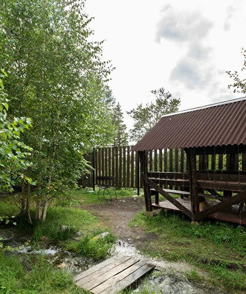 Перед домом бежит ручей. На территории находится детская площадка, беседки, стоянка для машин, баня и мангальная зона.