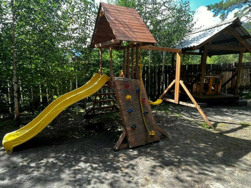 В номере тёплые полы, шикарный вид с балкона/окна на реку и горы. Перед домом бежит ручей. На территории мангальная зона, стоянка, беседки, детская площадка.