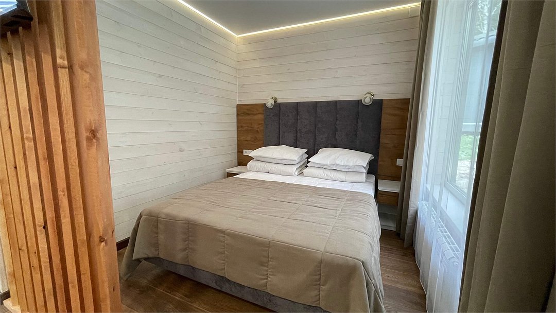 В домике имеется оборудованная кухня, обеденный стол, ванная комната с душевой кабиной, телевизор, Wi-Fi, тёплый пол.