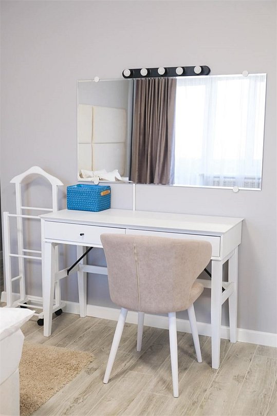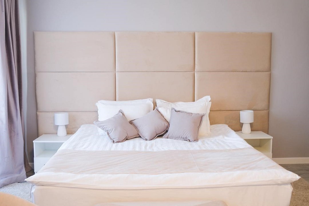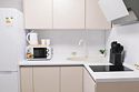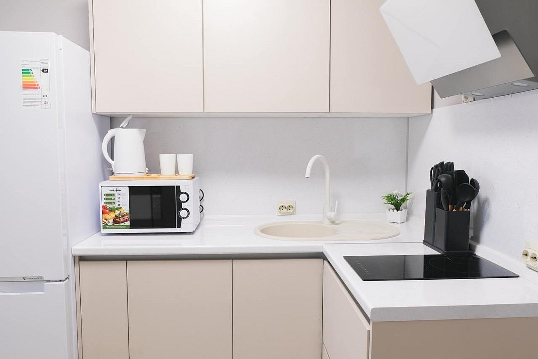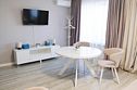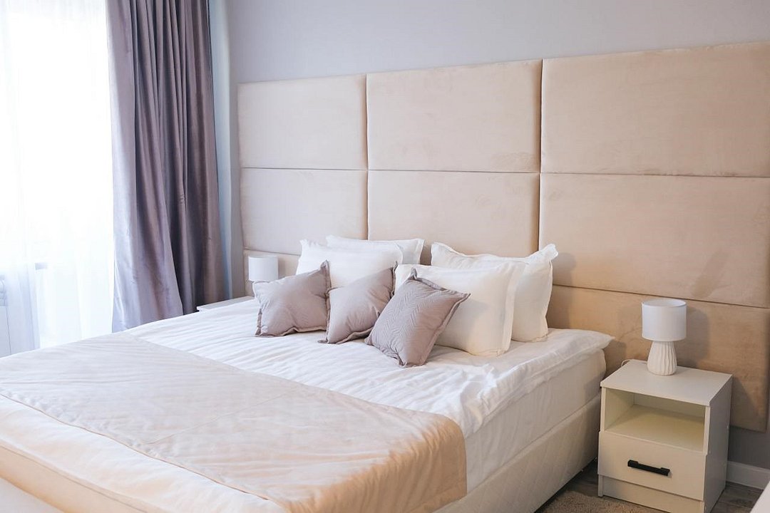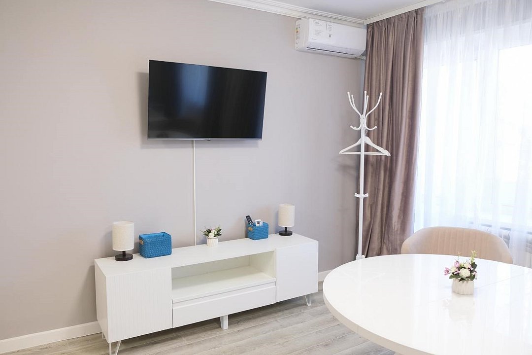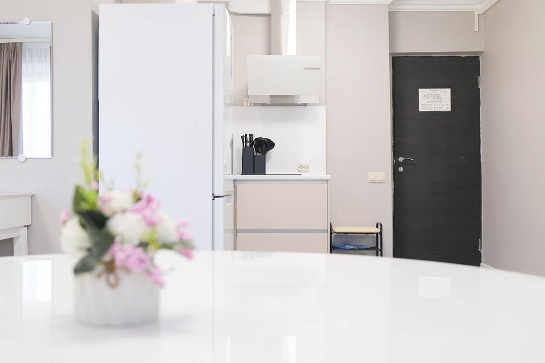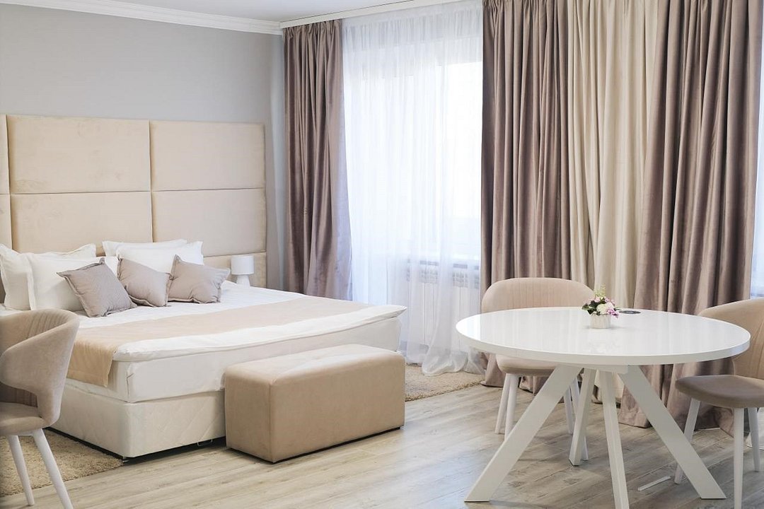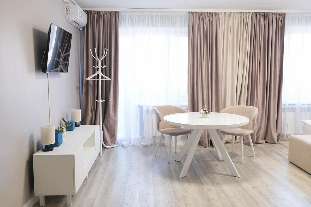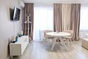Номер студия, оснащённая большой односпальной кроватью, полноценной кухней со всем необходимым (чайник, микроволновка, плита, посудомоечная машинка, посуда, столовые приборы), стол со стульями. В номере smart TV со спутниковым телевидением, оснащена комната кондиционером. В номере есть стиральная машина с функцией сушки, душевая кабина. Имеются два балкона.Услуги и удобства