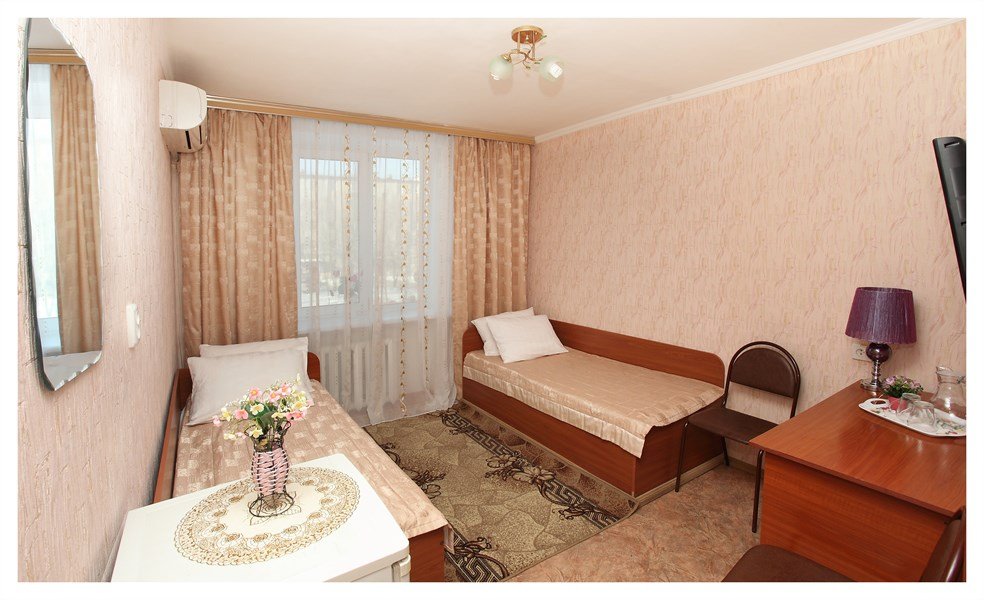 Уютный номер для двух человек с двумя одноместными кроватями — оптимальный вариант для отдыха или совместной деловой поездки. Номер оборудован всем необходимым для комфортного проживания или работы: удобные односпальные кровати, шкаф для одежды, рабочее место, санузел с ванной и туалетом, кондиционер и бесплатный Wi-Fi.Услуги и удобства