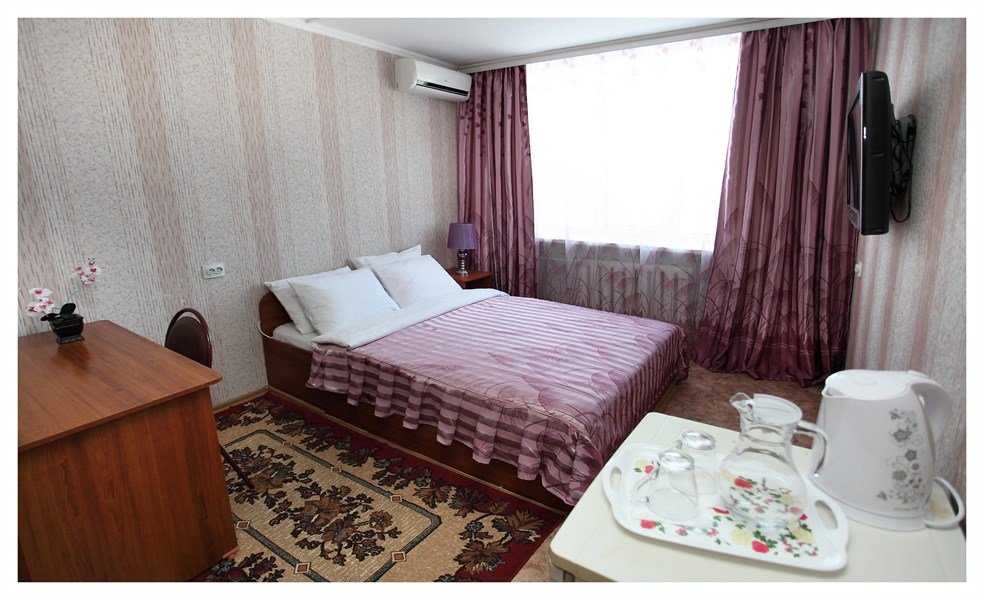 телевизор, Wi-Fi, телефон, холодильник, кондиционер, ванна, санузел, тапочки, двуспальная кровать, стулья, шкаф для одежды, вешалки, письменный стол, багажная тумба, зеркало, чайный набор, чайник, раковина, отопление, душ, вид на городВ номере