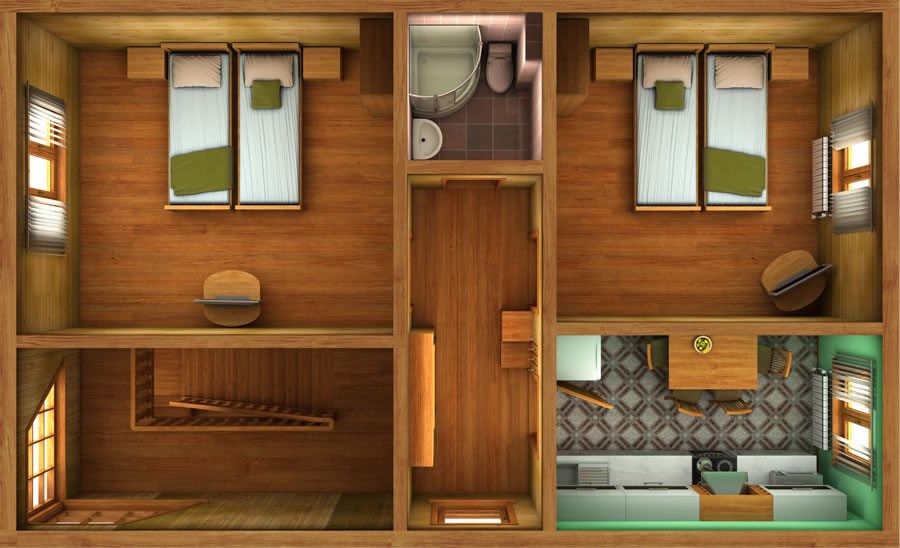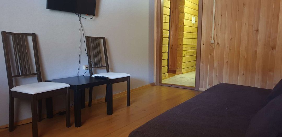 В номере: две односпальные кровати, две прикроватные тумбочки, два стула, журнальный столик, шкаф для одежды, ТВ с плоским экраном. На два номера общая оборудованная кухня, санузел с душевой кабиной, раковиной, унитазом.