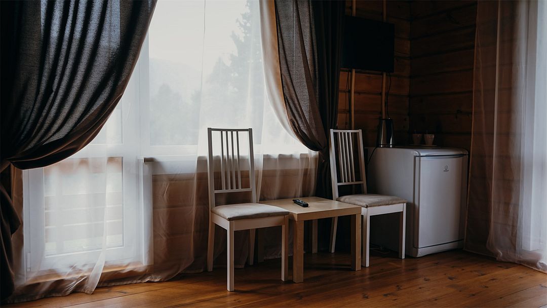 В номере: Гостиная: диван раскладной, два стула, журнальный столик, холодильник, чайник электрический, ТВ с плоским экраном; Спальня: двуспальная кровать, две прикроватные тумбочки, два стула, журнальный столик; Санузел с душевой кабиной, раковиной, унитазом. Два балкона на две стороны. Живописный вид на озеро и горы.