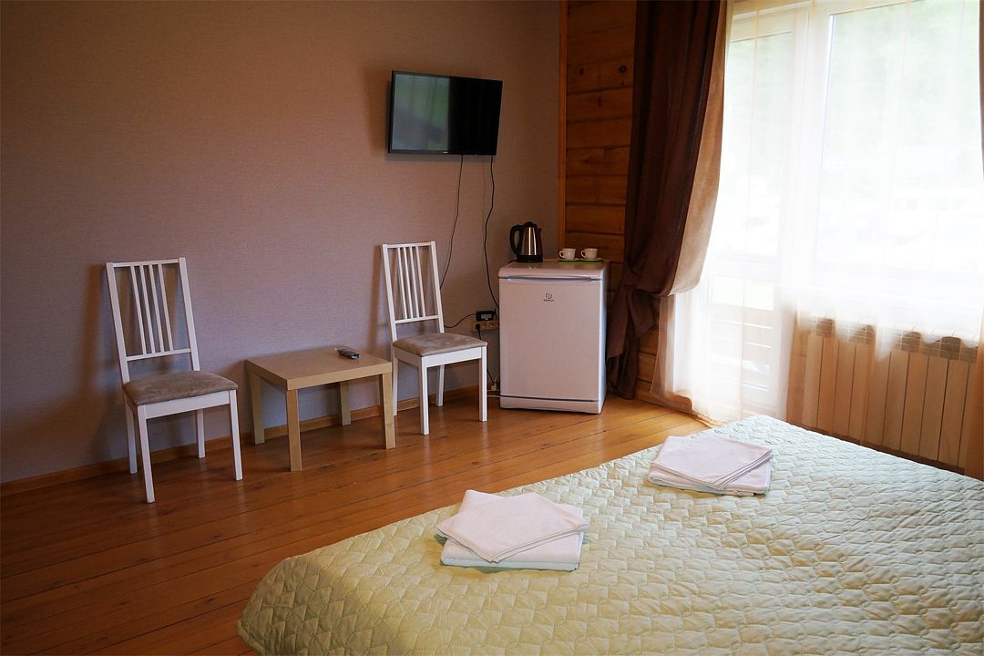 В номере: двуспальная или две односпальные кровати, две прикроватные тумбочки, два стула, журнальный столик, холодильник, чайник электрический, ТВ с плоским экраном.