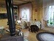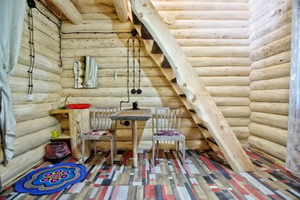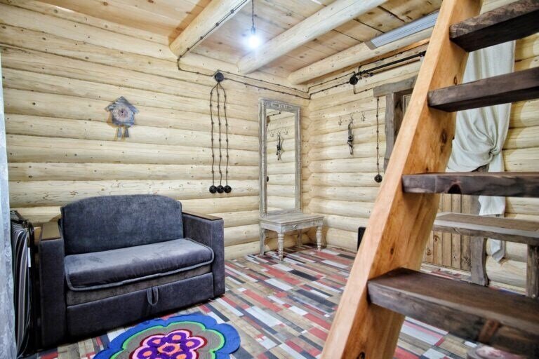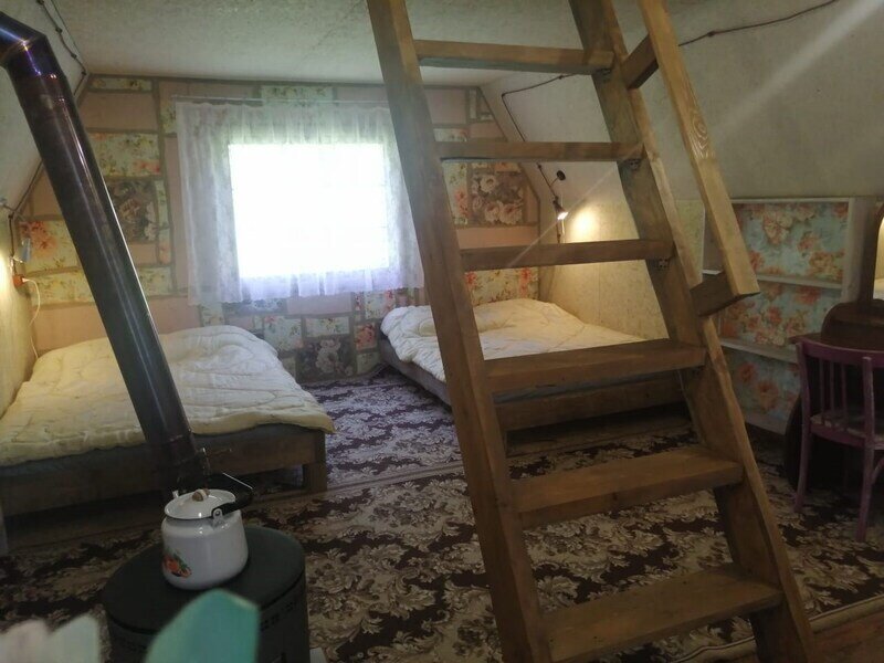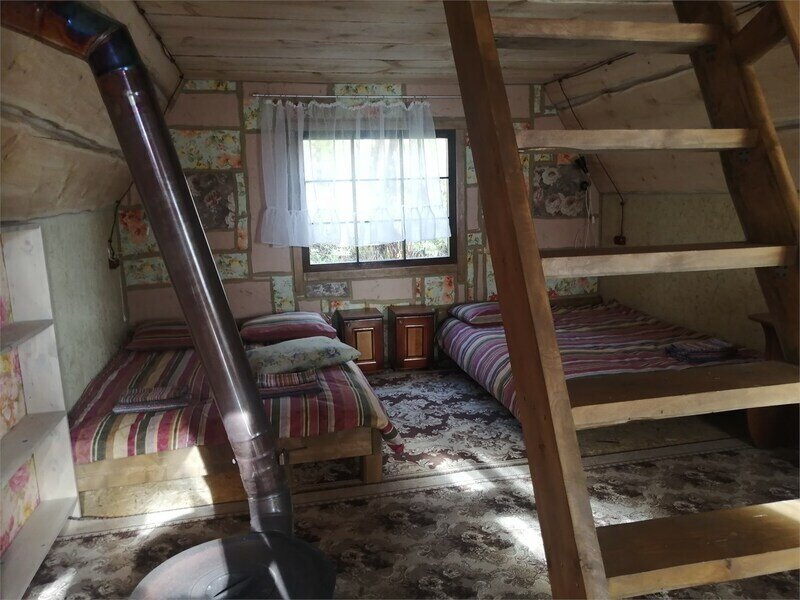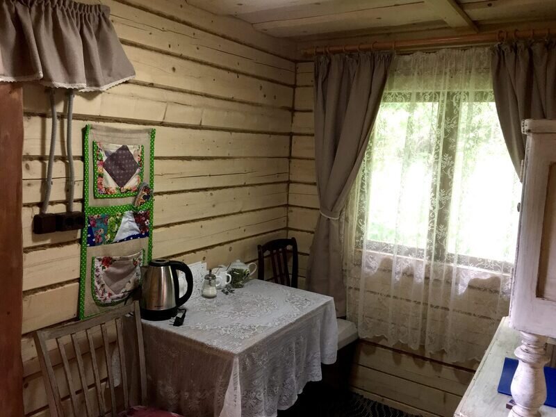 На первом этаже помимо дивана есть столик, два стула, раковина с зеркалом и старинное трюмо. Электрический чайник, чашки с блюдцами, фен. Предусмотрено отопление.