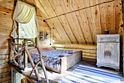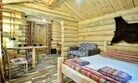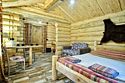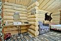 Двуспальная кровать из массива дерева, грубый деревянный стол и стулья, шкура медведя на стене, имитация домотканых половичков и покрывала помогут прочувствовать атмосферу настоящей лесной избушки. На окнах пестрые занавески и цветы в горшках.