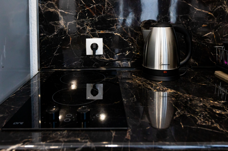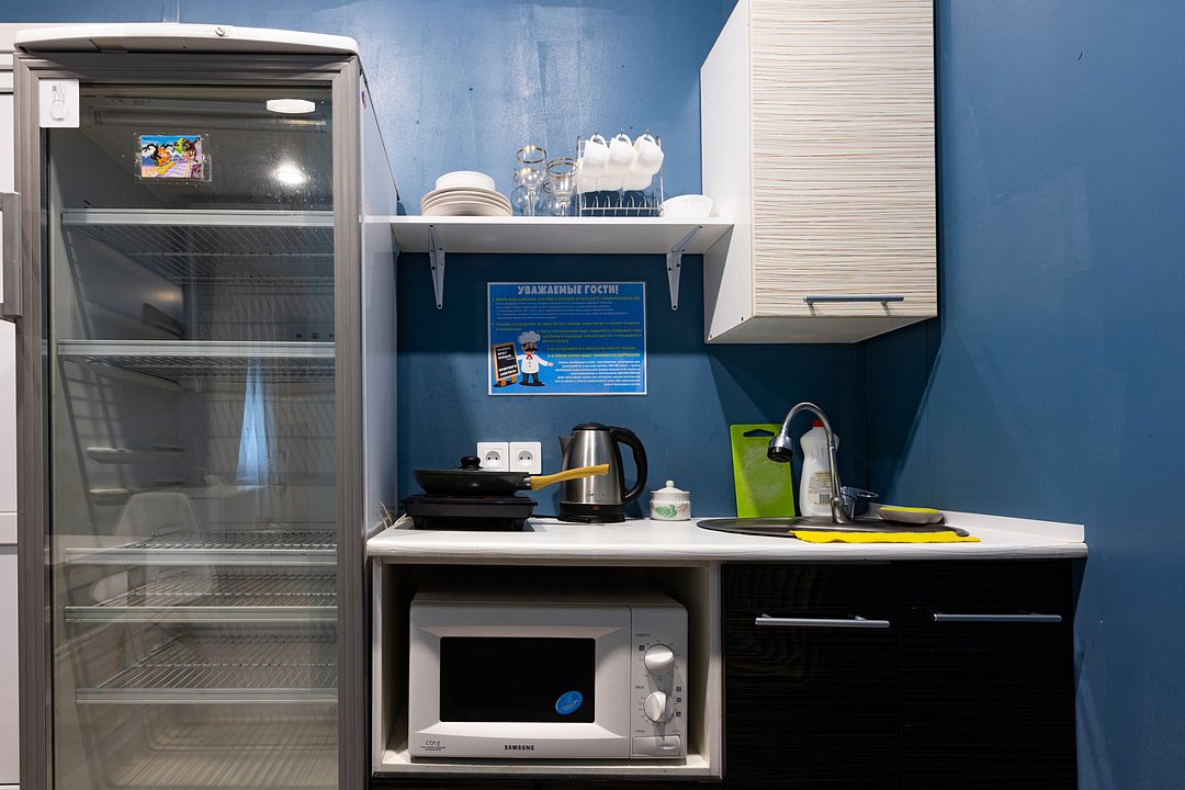 - оборудованная кухня (большой двухкамерный холодильник, варочная поверхность, микроволновка, чайник, необходимый набор посуды);