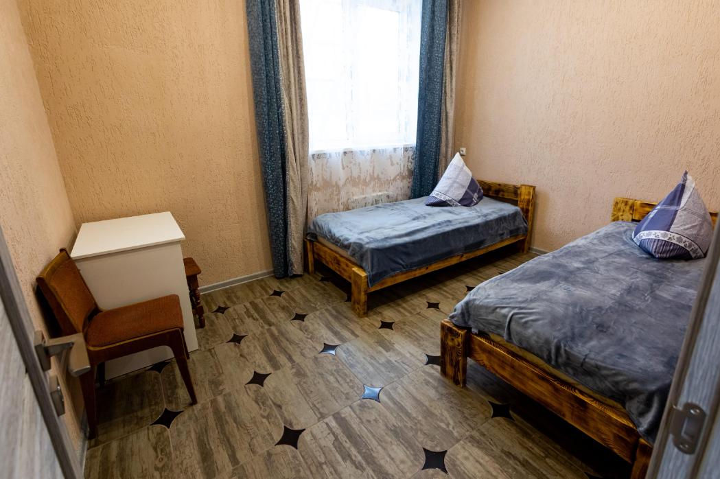 Комната №1: две односпальные кровати, двухъярусная кровать, ортоп. матрасы, чистое постельное бельё, стол, вешалка.