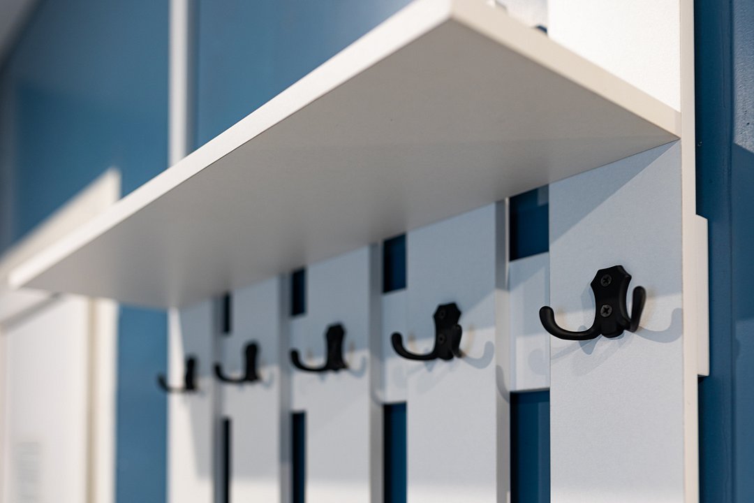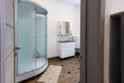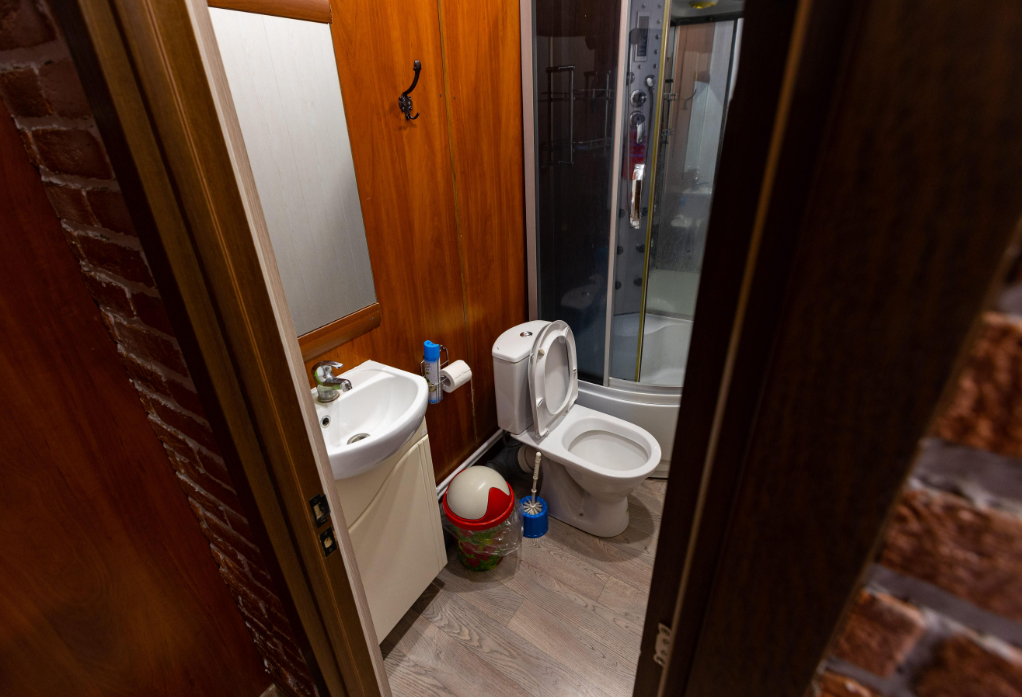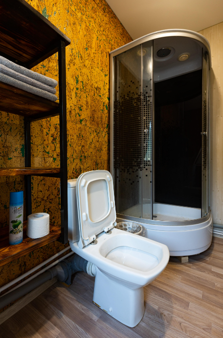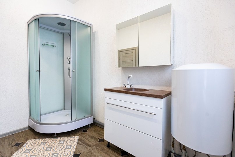 Санузел: душ, туалет, умывальник, зеркало, вешалка.