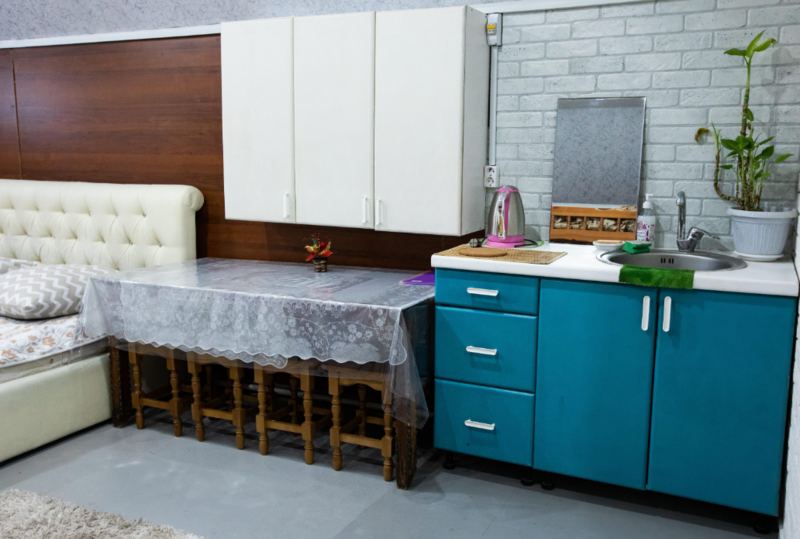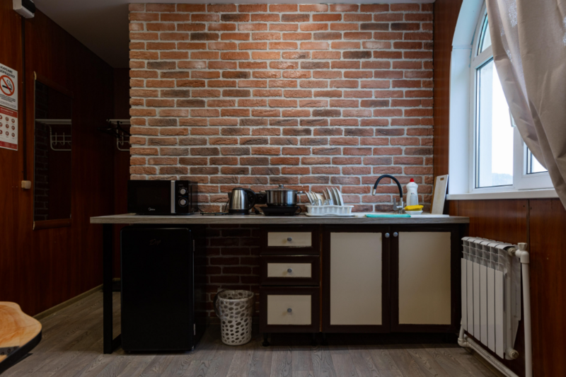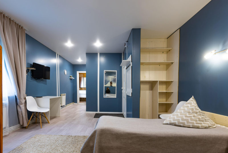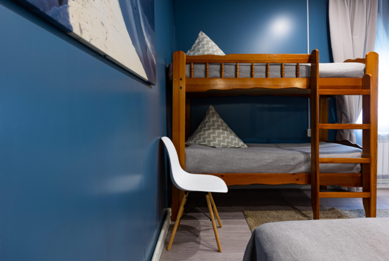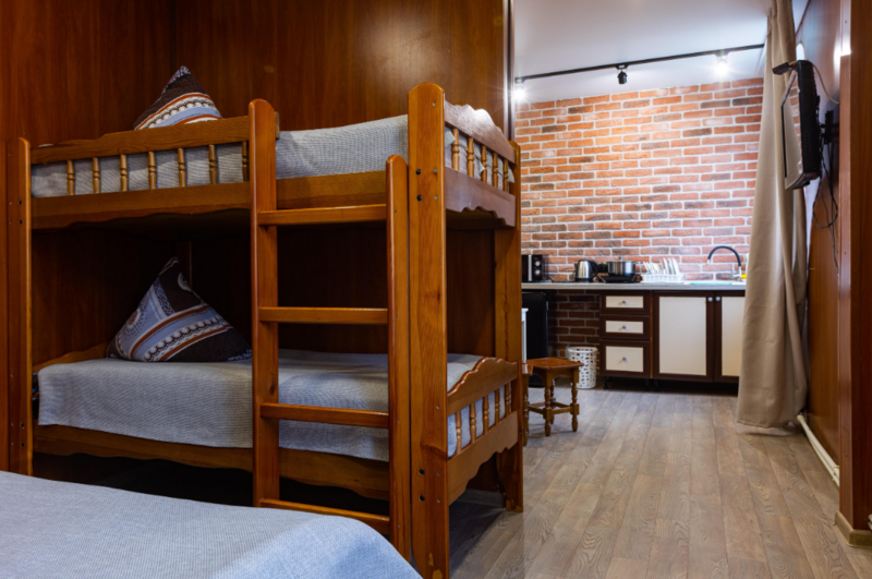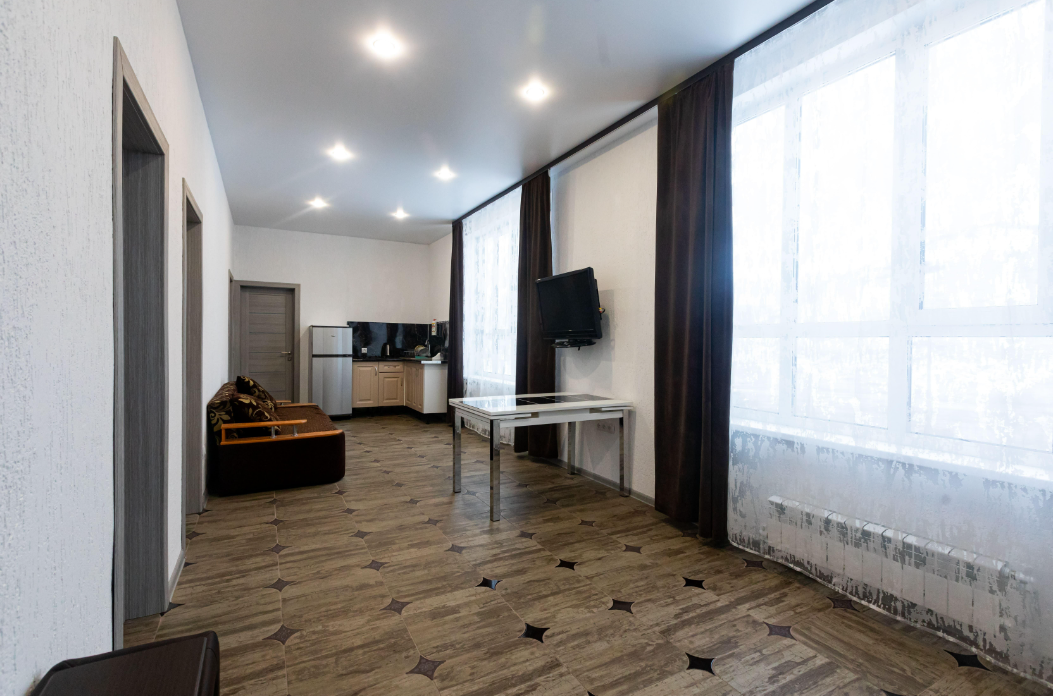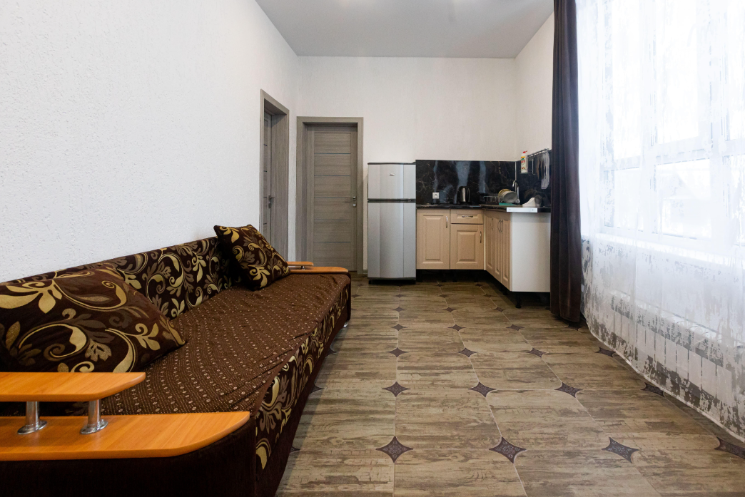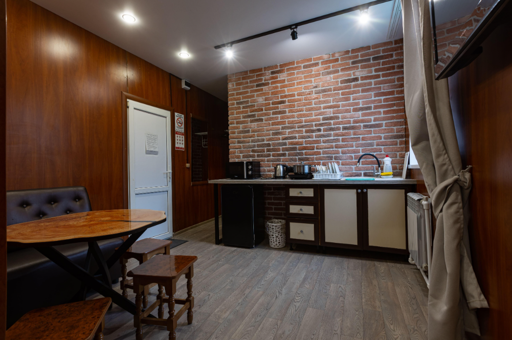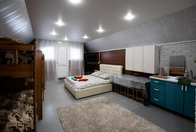 Большой номер площадью 30 кв.м. с возможностью размещения до 4 гостей. Спальные места - две односпальные кровати, которые при необходимости можно совместить и большая двухъярусная кровать. Номер разделен на три полноценные зоны: спальня, кухня и санузел.