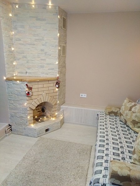На первом этаже располагаются: гостиная с телевизором, кухонная зона, санузел, сухая баня, одна спальня с камином. На втором этаже: три спальни и зал с телевизором и двумя раскладными диванами.