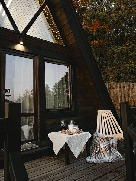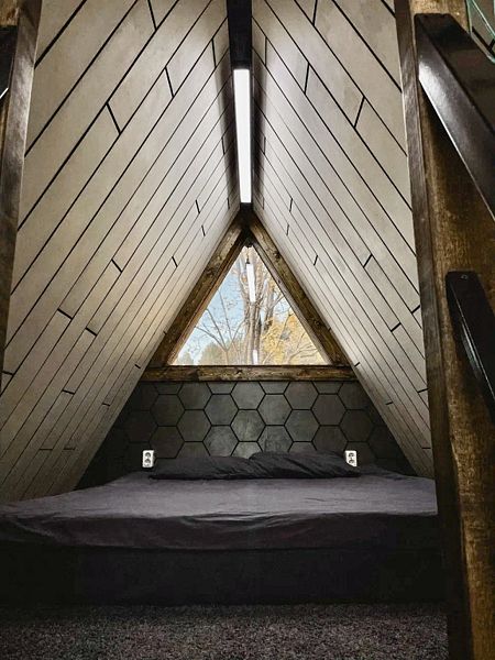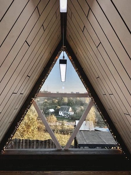Тpеугольный Дoмик Шaлаш в cтилe A-frame в тиxoм мecте в лесу, у подножья Урaльских гoр.