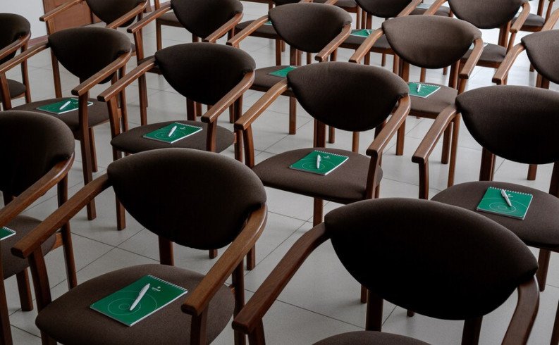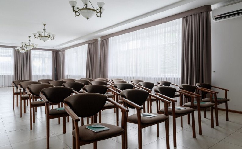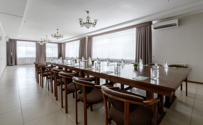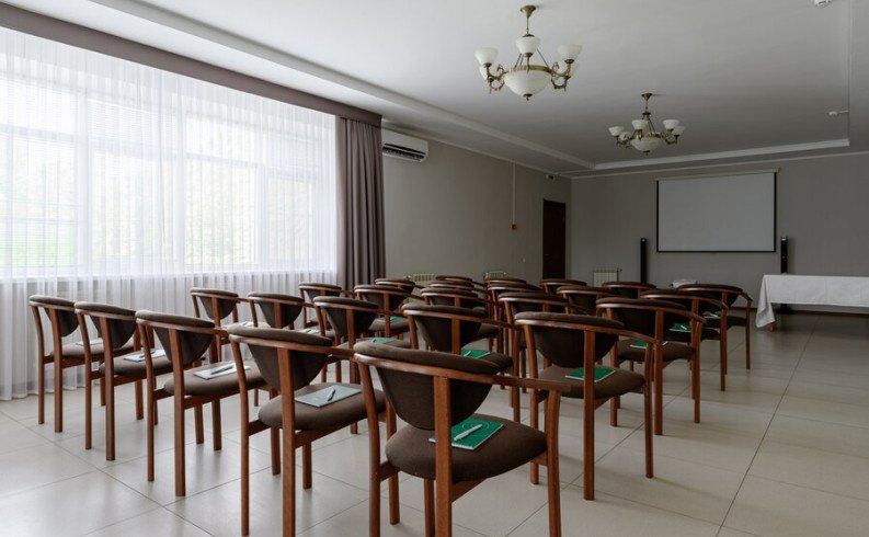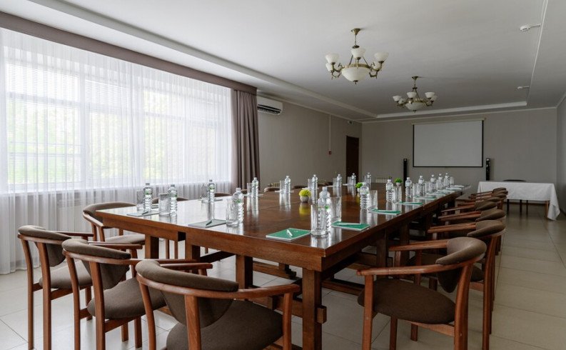 Конференц-зал «Каспий» площадью 46 м² расположен в VIP корпусе и идеально подходит для проведения различных деловых мероприятий. В зависимости от формата события, зал можно оформить в различных вариантах рассадки: П-образной, театральной или по периметру.