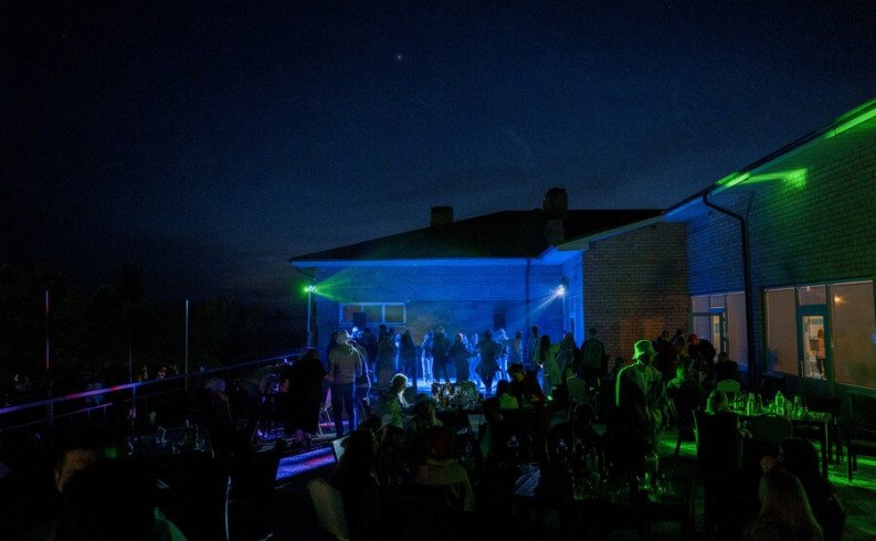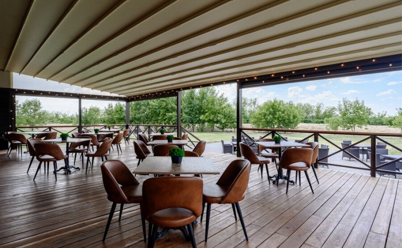 Открытая терраса площадью 150 м² идеальна для проведения банкетов и фуршетов. Пространство можно оформить по разнообразным схемам рассадки, что позволяет создать уютную атмосферу для любого мероприятия.
