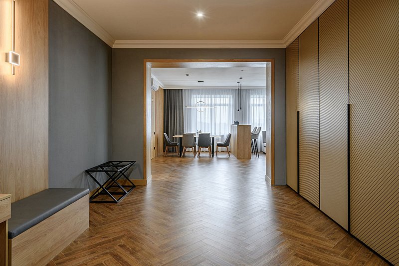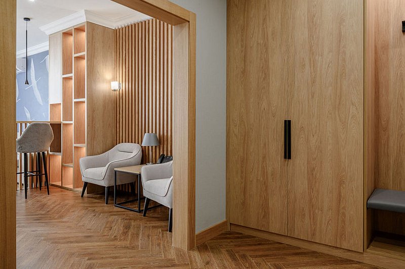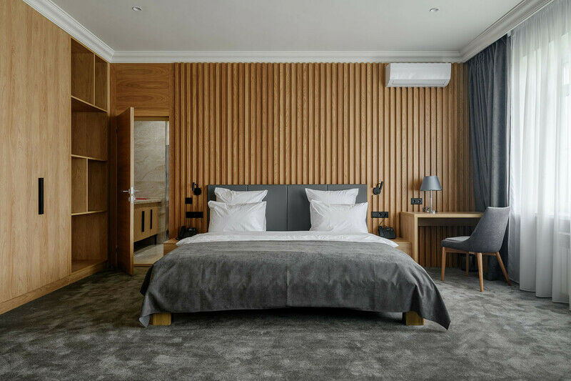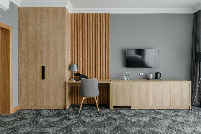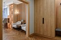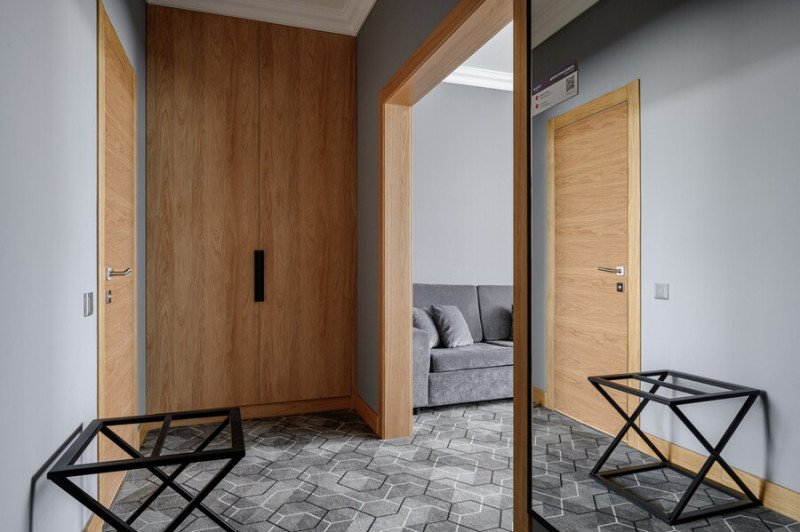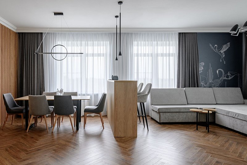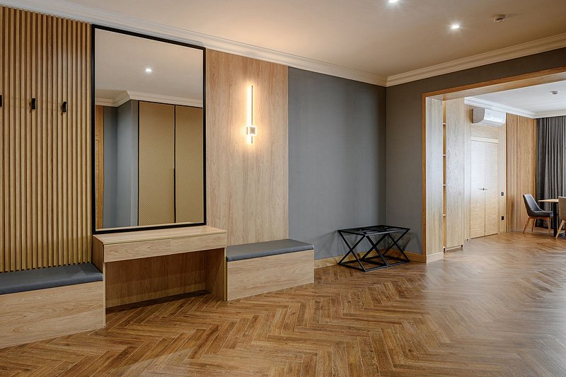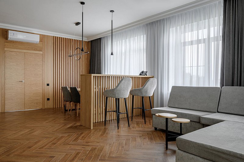 Комфортабельный трехкомнатный номер с современной функциональной мебелью. В номерах расположены диваны, которые можно использовать как полноценное спальное место.